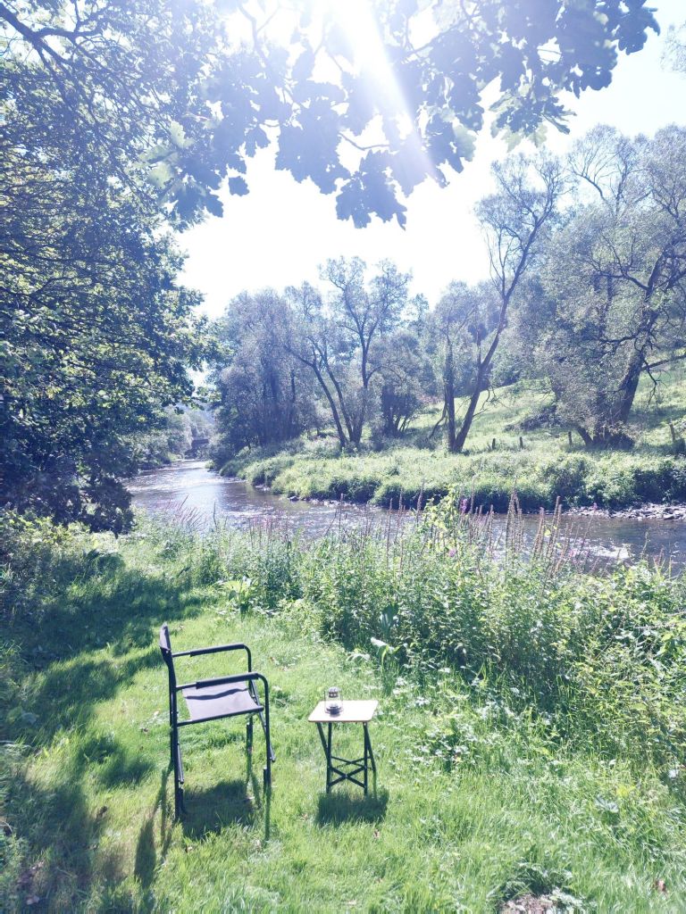 Als de zon wakker wordt, sta ik ook op. Luc draait zich nog een keer om. Ik neem m’n statief mee en wandel het kleine stukje bos naast de camping in. Het is nog stil, op de ook al wakker geworden vogels na. Eendjes laten zich meevoeren door de stroming, een reiger rust uit op een stuk steen dat boven het water uitsteekt. Of zit te loeren naar een visprooi, dat kan ook. Als hij in de gaten krijgt dat ik op het bruggetje sta, vliegt ie weg.