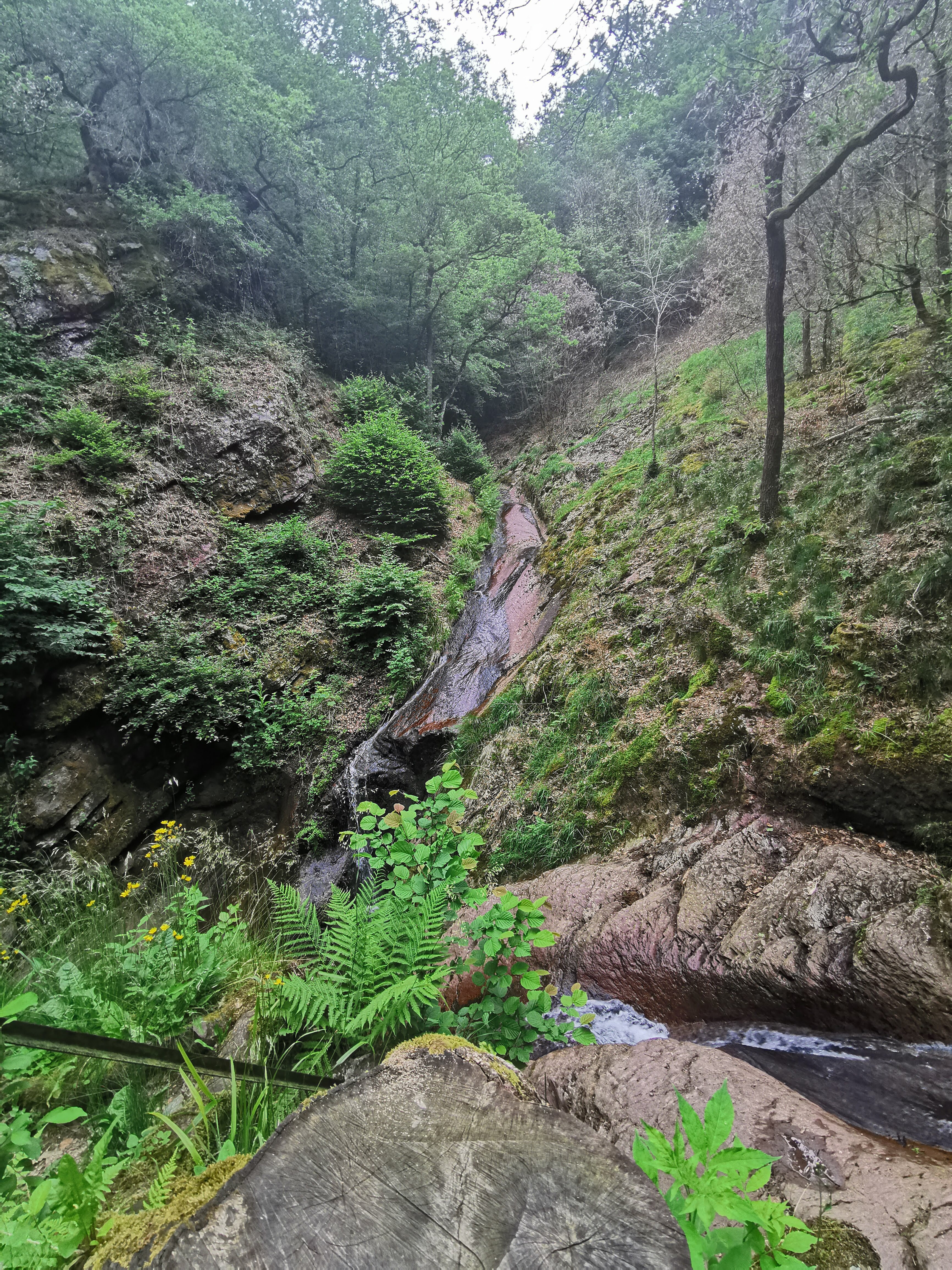 Af en toe krijgen we een paar druppels regen, maar niet meer dan dat. Ineens moeten we ergens over gladde rotsstenen verder. Er is wel een touw in de wand gebeiteld, maar ik heb er toch moeite mee. Op dit punt is er geen makkelijker alternatief te zien. Ik heb geen zin om terug te gaan, en ik wil ook niet opgeven. Een bult en blauwe plek op mijn knie later ben ik er doorheen. Als we een eind verder nog zo’n moeilijk stuk tegenkomen zakt de moed me in m’n schoenen. Vooruit zie ik niet zitten, achteruit ook niet meer. Blijft er maar één optie over. Ik doe mijn broekspijpen omhoog en stap dan maar gewoon dwars door de rivier tot het volgende punt. Het water komt maar tot m’n enkels, m’n schoenen blijken waterdicht te zijn, dus ik heb geluk. We worden beloond met een mooi watervalletje. Slokje water, foto, en weer door.