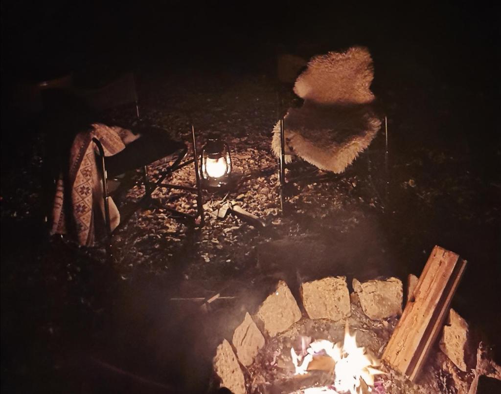 We verkennen even de directe omgeving. We konden pas na 15.30 uur hier terecht, dus een lange wandeling zit er niet meer in. Geeft niet, we moeten niks. Gewoon hier zitten is al zalig. Het is dat je in de verte nog verkeer kunt horen, waardoor je weet dat je niet echt in de middle of nowhere bent, maar verder is het stil. Vogeltjes fluiten, bladeren dwarrelen hier en daar van de bomen, alles is herfst. Met een mooie temperatuur voor de tijd van het jaar. Het wordt al vroeg donker dus Luc steekt het vuur aan. Een worstenbroodje erbij als avondeten, stoelen aanschuiven bij het vuur, en genieten.