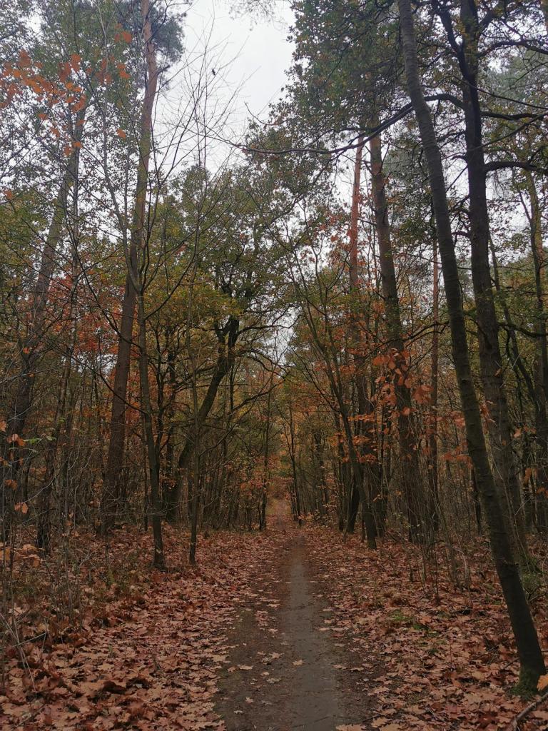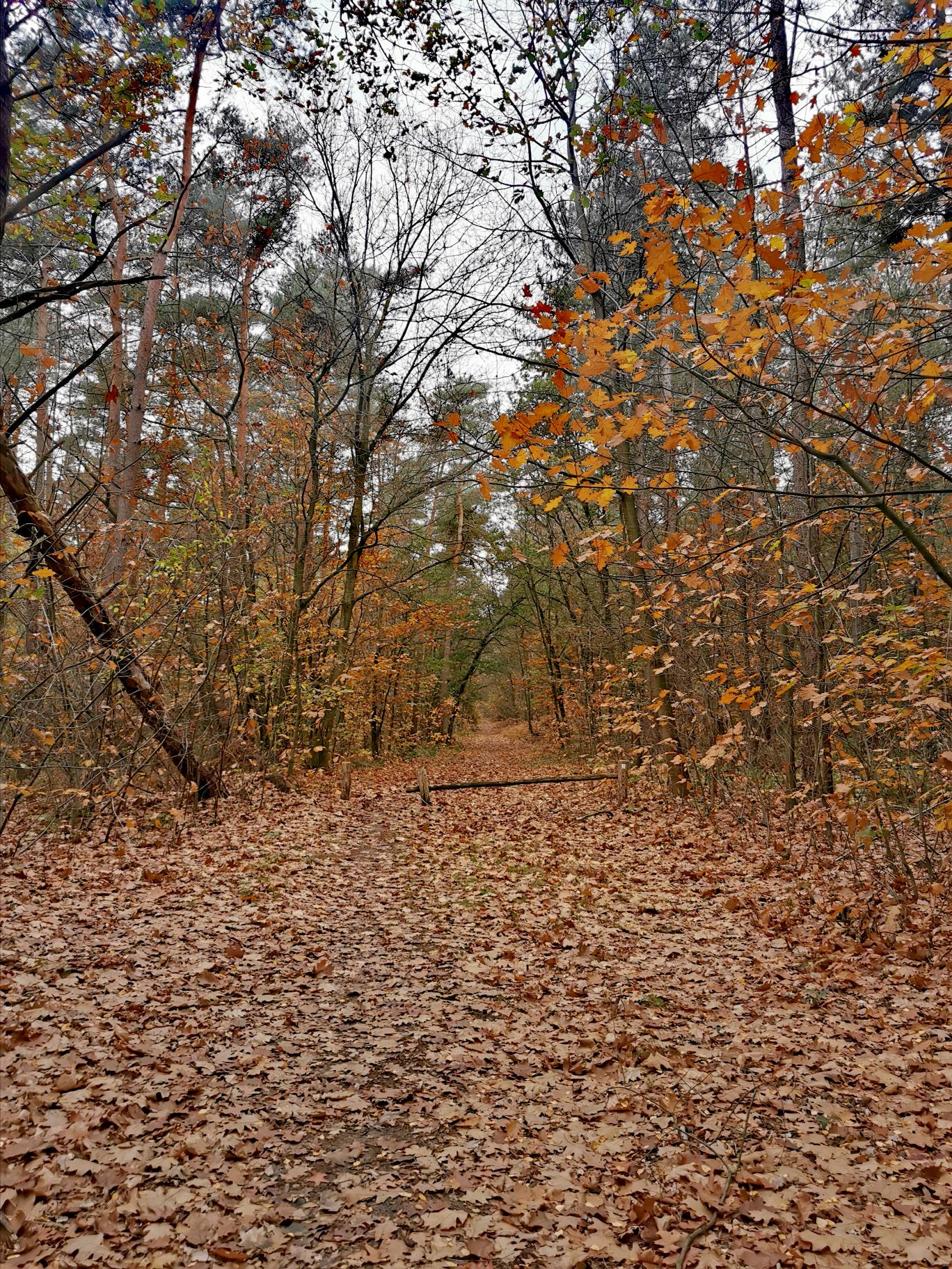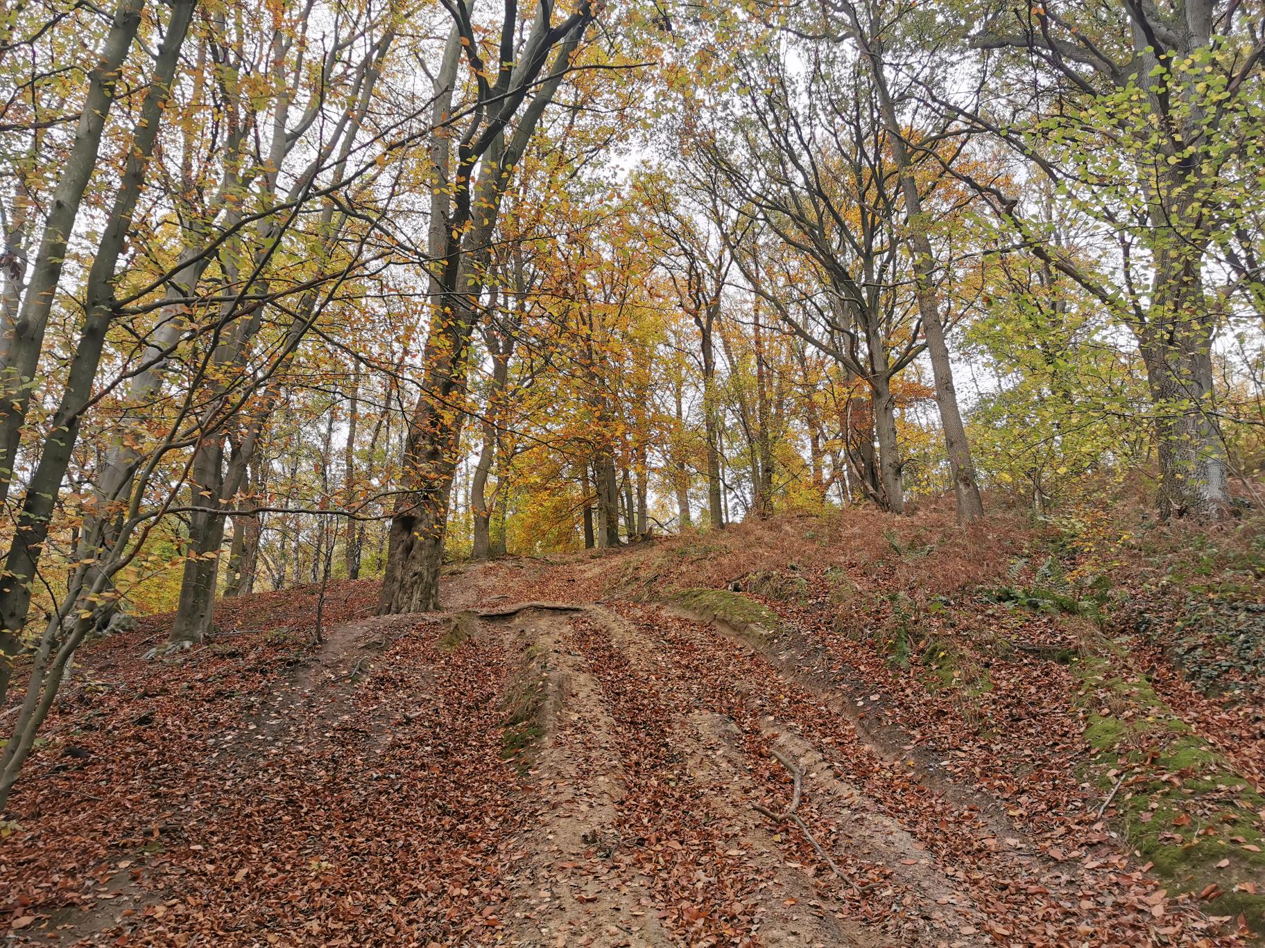 Als we de volgende ochtend opstaan is het opnieuw best mooi weer. Iets minder zon, maar de temperatuur is zeker fantastisch voor de tijd van het jaar. Ik heb slecht geslapen, dus ik kom wat traag op gang. Ofja, eigenlijk kom ik altijd traag op gang, maar nu dus ook. We ontbijten buiten. Ik hoef niet eens een jas aan. Als de thermos koffie leeg is trekken we de wandelschoenen aan en gaan de wijdere omgeving verkennen. Eenmaal van het terrein af besluiten we om meestal zomaar wat bospaadjes te volgen, en niet steeds de aangegeven wandelroutes. Er zijn vandaag veel mensen die het bos opzoeken. Logisch. Brede wandelpaden wisselen we af met kleine weggetjes, en af en toe moeten we zelfs een behoorlijke klim doen.