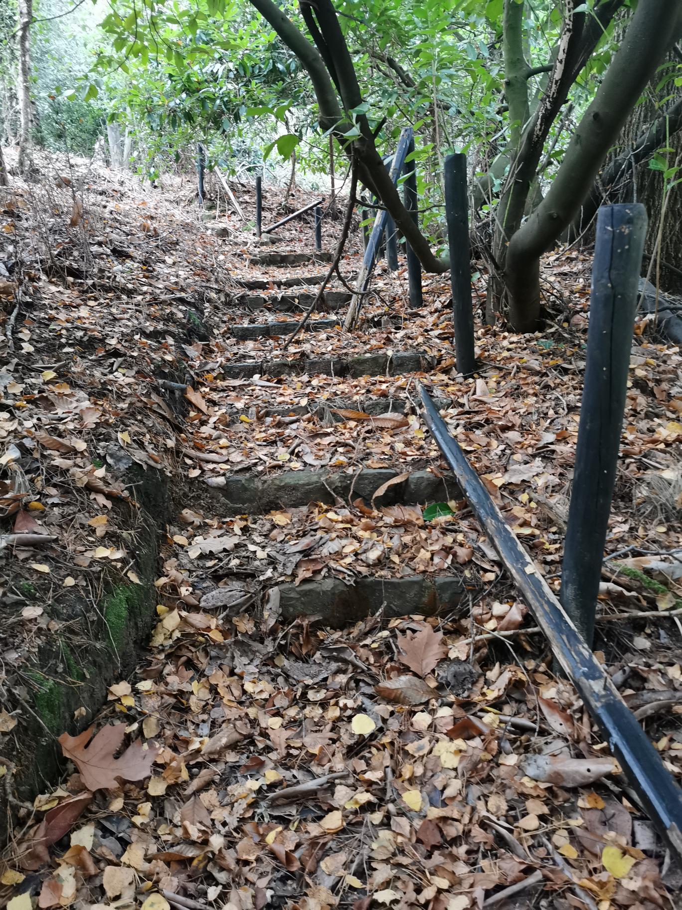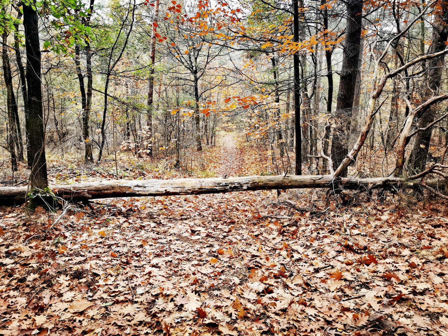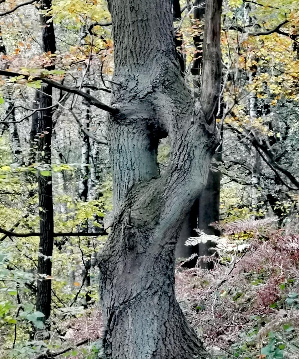 Als we de volgende ochtend opstaan is het opnieuw best mooi weer. Iets minder zon, maar de temperatuur is zeker fantastisch voor de tijd van het jaar. Ik heb slecht geslapen, dus ik kom wat traag op gang. Ofja, eigenlijk kom ik altijd traag op gang, maar nu dus ook. We ontbijten buiten. Ik hoef niet eens een jas aan. Als de thermos koffie leeg is trekken we de wandelschoenen aan en gaan de wijdere omgeving verkennen. Eenmaal van het terrein af besluiten we om meestal zomaar wat bospaadjes te volgen, en niet steeds de aangegeven wandelroutes. Er zijn vandaag veel mensen die het bos opzoeken. Logisch. Brede wandelpaden wisselen we af met kleine weggetjes, en af en toe moeten we zelfs een behoorlijke klim doen.