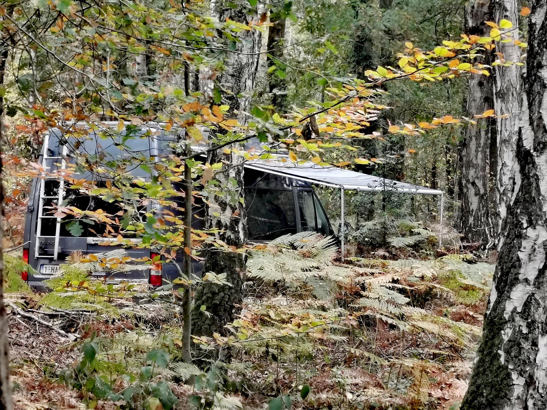 Het voorjaar ging voorbij, de zomer ging voorbij, en de bus bleef thuis. Het was niet het moment om rond te gaan toeren. Heel jammer, maar het was nu eenmaal niet anders. Buitenlandse plannen werden geschrapt, maar ook de plannen om dan maar naar een camping in eigen land te gaan. De leukste waren allemaal volzet. Maar dan kwam ik per toeval een geschikte plek tegen. Iemand verhuurde een stuk bos van 4 ha. En we moesten er niet de grens voor over, zelfs niet buiten onze eigen provincie. En ook niet onbelangrijk, we zouden er maar alleen staan. Nog coronaproofer kon het niet. ‘Zullen we……? Ja, we zullen.’