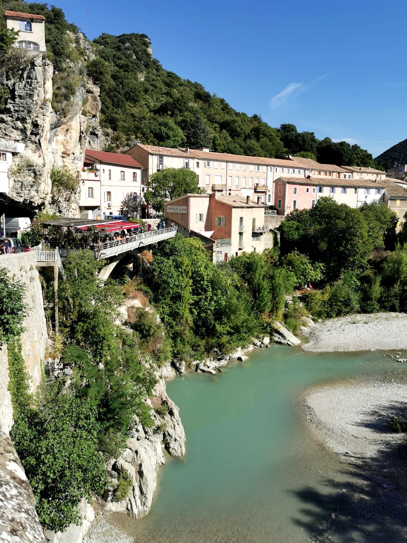 Ook al is het een leuke camping hier in Mons, en was de douche zalig, we gaan toch maar weer verder. We ontbijten nog eerst op ons gemak in de zon. De zomervakantie is gisteren naadloos overgegaan in herfstvakantie. Maar van regen, kou en rode afgevallen bladeren is hier geen sprake. In korte broek en met zonnebril checken we op de kaart welke richting we zullen uitgaan. We prikken willekeurig een plaats op de kaart. Nyons wordt het.