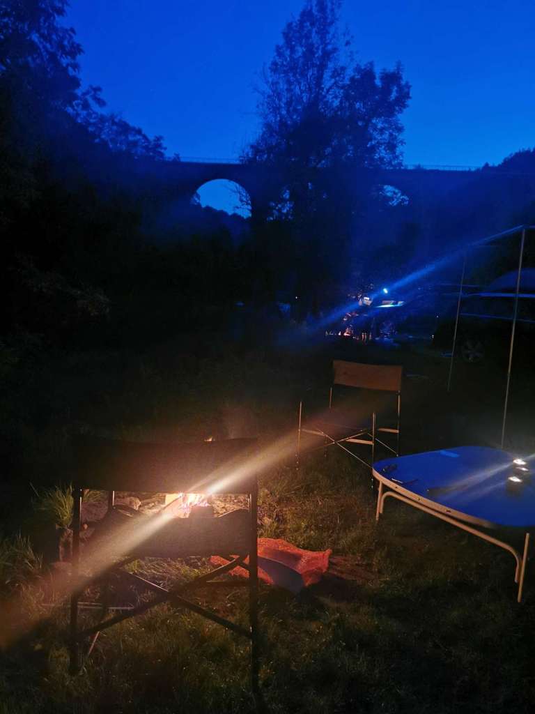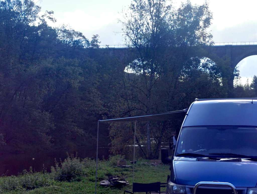 Er is nog plek op de camping, en we installeren ons langs het riviertje. Het is een retro-camping en met een oldtimer krijg je korting. Je ziet hier dan ook vanalles door elkaar staan. Er staan ook superveel pipowagens die je kunt huren. Het is wel allemaal oud en rommelig, en eigenlijk onooglijk, maar toch heeft het zijn charme. Vooral de oude bogenbrug geeft het een fantastisch decor.