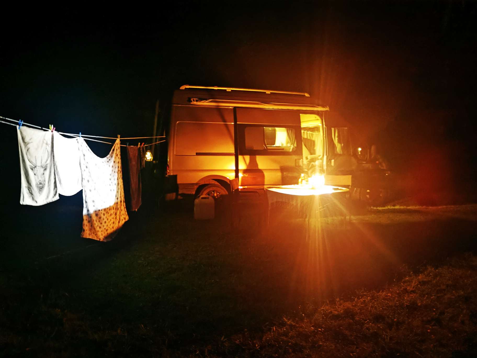 Het is al donker als we met onze sleutel naar de privé douche gaan. De douches zijn basic maar proper. We blijven er lekker lang onder staan. Het is echt luxe na een paar dagen wassen aan de wasbak. Zeker met dit weer. Het is stikdonker hier, dus we steken de stormlamp aan en blijven nog even buiten zitten. Alweer een heldere sterrenhemel, maar met nu een vallende ster. *wens* Een wijntje/biertje erbij, en alweer een uil op de achtergrond maakt het plaatje af. Wel horen we geregeld geritsel in het bos naast onze plek. Ik hoop alleen maar dat het die ork niet is.