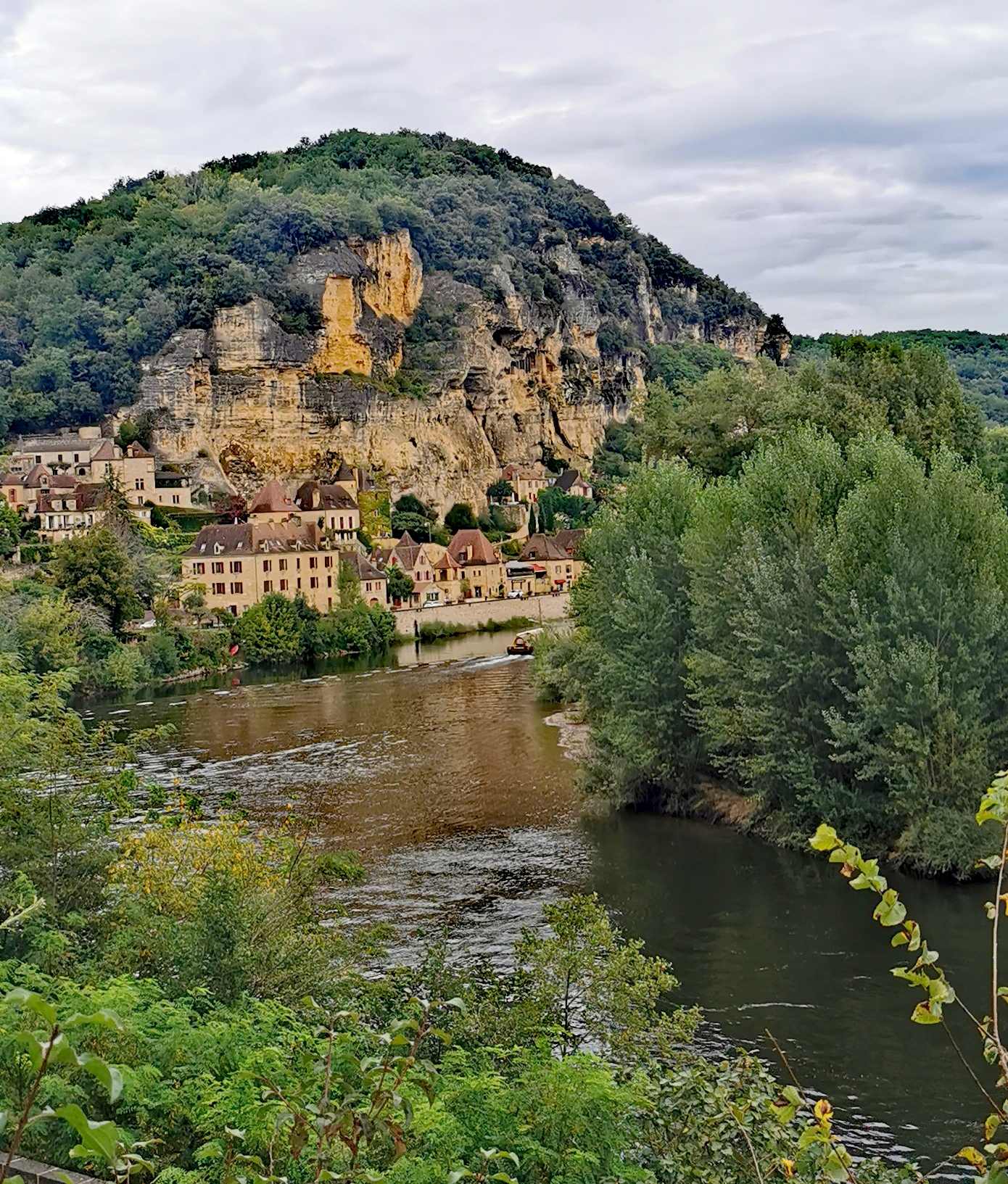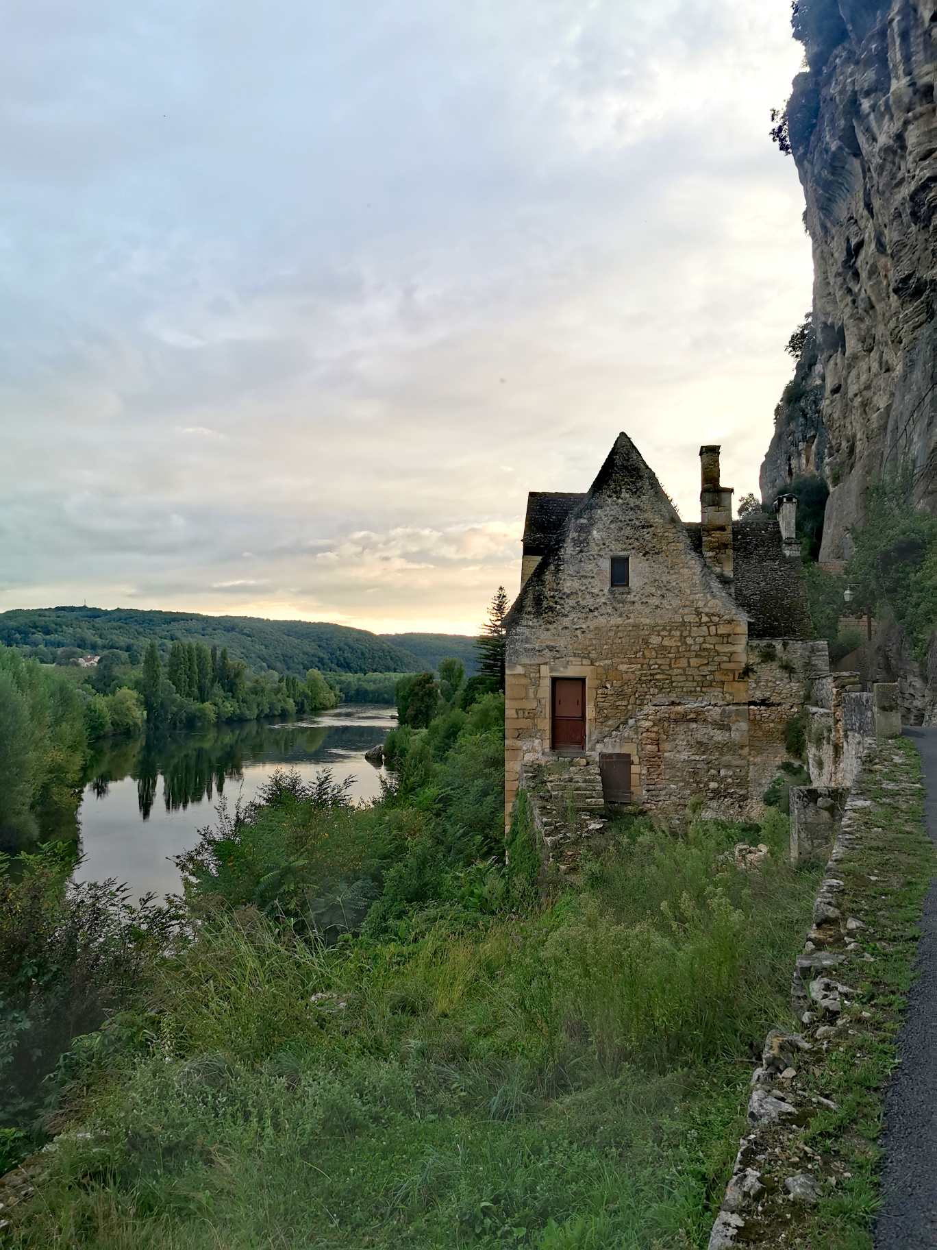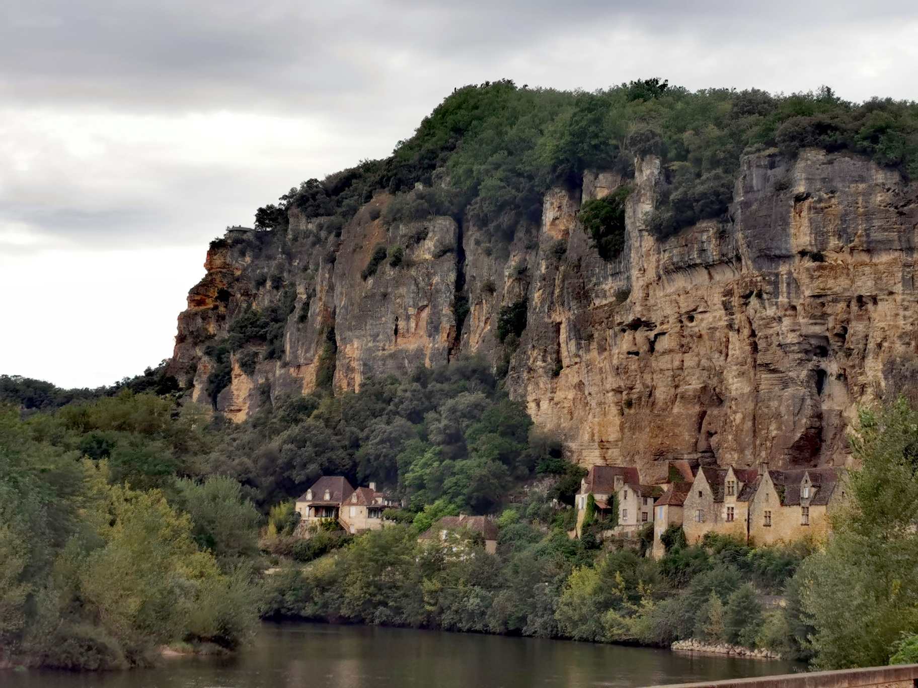 Algauw bereiken we het middeleeuws dorpje tegen een bergwand, vlak naast de Dordogne rivier. Net voorbij het centrum is een camping , en we gaan een kijkje nemen. Bij het oprijden valt het wat tegen. Wat een drukke camping. Het eerste wat opvalt is de kale vlakte waar een hoop grote frigo’s op wielen geparkeerd staan, netjes in rijen. Niet ons ding. Het is goedkoper dan op de eigenlijke camping gaan staan, maar een leuke plek vinden wij belangrijker. We melden ons aan bij de receptie , en dit is de eerste keer dat we onze covid-safe document moeten laten scannen. Uiteraard geen probleem. En we hebben geluk. Op mijn vraag of er toevallig aan het water nog een plekje is, knikt hij bevestigend. ‘Helemaal op het einde van de rij, ga maar kijken of je het daar leuk vindt.’ Niet verwacht hier, maar het is een supergave plek. Vanuit onze keuken (slash woonkamer slash terras) kijken we direct uit op de rivier. Vanuit onze slaapkamer hebben we zicht op een kasteel, een rotsig gebergte en een wei. Ja hoor, we zullen het hier wel even uithouden.