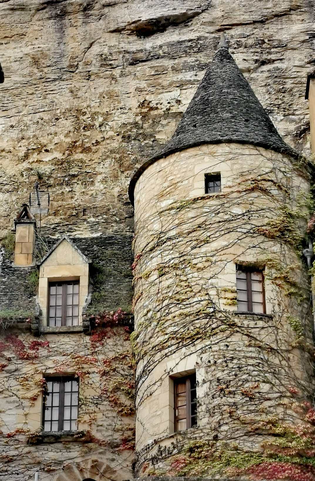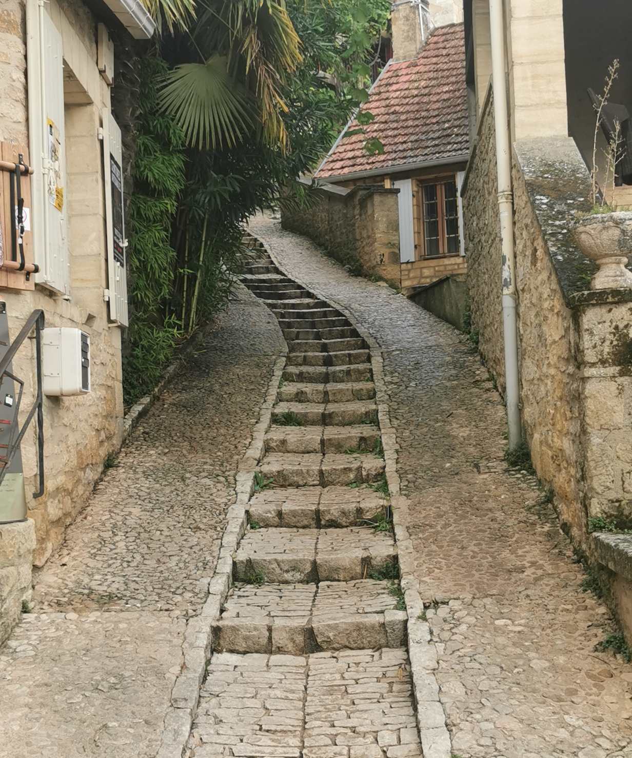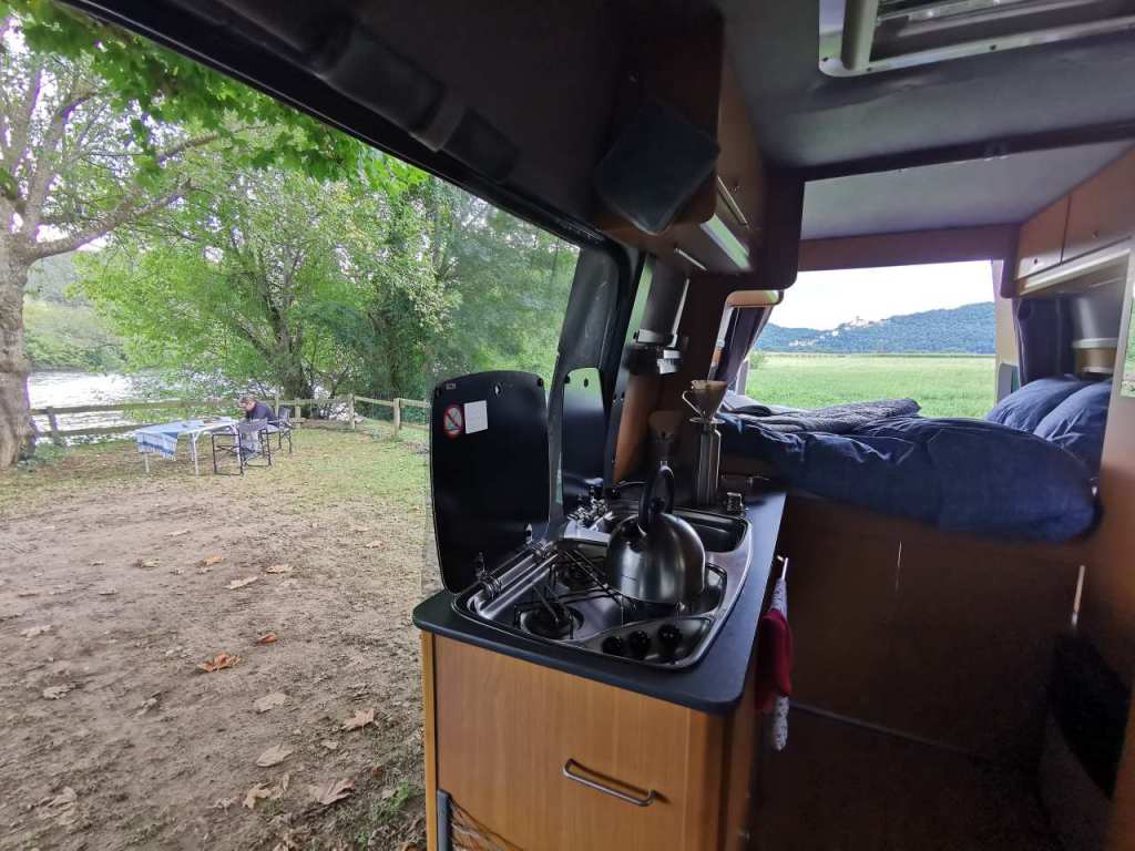 Algauw bereiken we het middeleeuws dorpje tegen een bergwand, vlak naast de Dordogne rivier. Net voorbij het centrum is een camping , en we gaan een kijkje nemen. Bij het oprijden valt het wat tegen. Wat een drukke camping. Het eerste wat opvalt is de kale vlakte waar een hoop grote frigo’s op wielen geparkeerd staan, netjes in rijen. Niet ons ding. Het is goedkoper dan op de eigenlijke camping gaan staan, maar een leuke plek vinden wij belangrijker. We melden ons aan bij de receptie , en dit is de eerste keer dat we onze covid-safe document moeten laten scannen. Uiteraard geen probleem. En we hebben geluk. Op mijn vraag of er toevallig aan het water nog een plekje is, knikt hij bevestigend. ‘Helemaal op het einde van de rij, ga maar kijken of je het daar leuk vindt.’ Niet verwacht hier, maar het is een supergave plek. Vanuit onze keuken (slash woonkamer slash terras) kijken we direct uit op de rivier. Vanuit onze slaapkamer hebben we zicht op een kasteel, een rotsig gebergte en een wei. Ja hoor, we zullen het hier wel even uithouden.