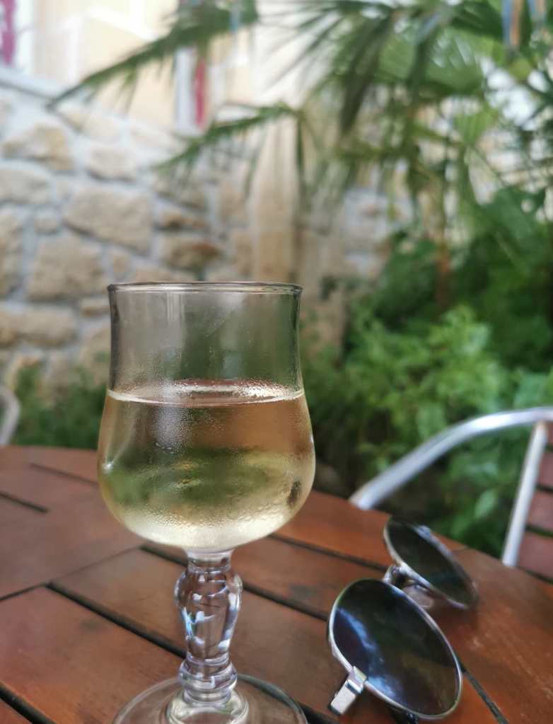 We snuisteren wat rond in een paar kleine winkeltjes, zonder iets te kopen. Ik heb een paraplu meegenomen, maar het is niet nodig. We hebben zon, en zoeken een tafel in de schaduw op een terras.