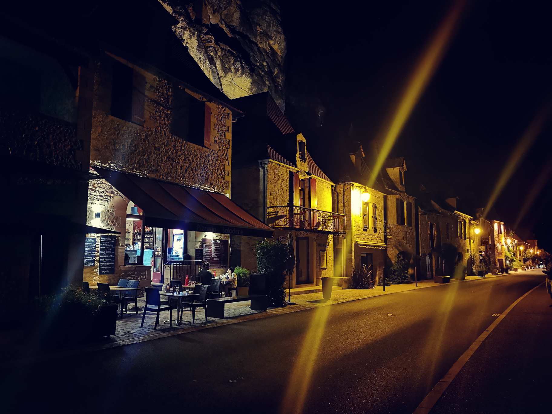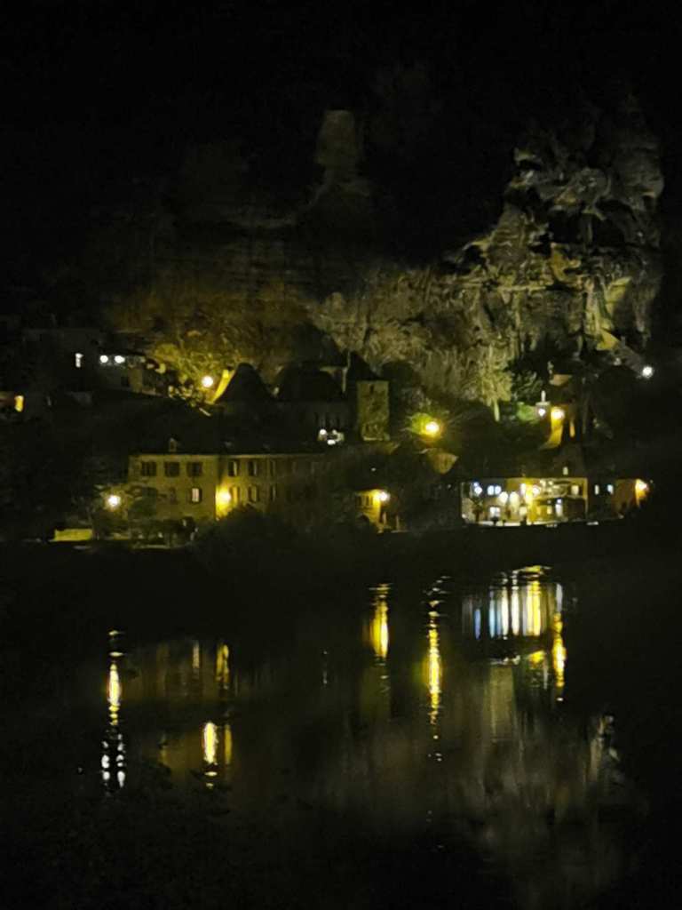 In het donker wandelen we terug naar de camping. Het laatste stuk wat bijschijnend met de telefoon. Het dorp is prachtig ’s avonds, zo verlicht tegen de rotswand. Ik ben niet goed in nachtfoto’ s maken, in het echt is het veel idyllischer. La Roque gageac. Eentje om te onthouden.