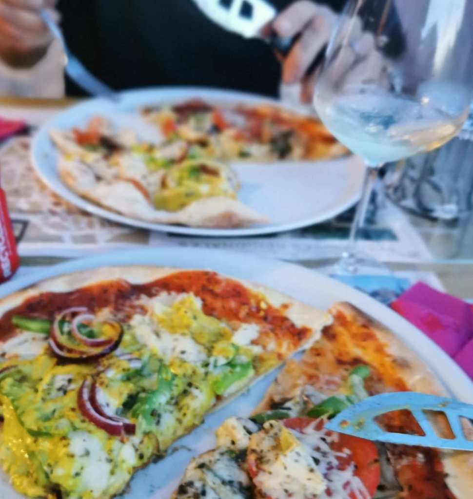 Op de camping frissen we ons op, kleden ons om, en zijn weer klaar voor vertrek. Geen zin in het noodrantsoen soep met crackers, dus op naar het dorp voor een etentje. Te voet. Het wordt pizza, op een klein terrasje naast de straat. Chez Tom. Het is zalig buiten, en de pizza ook.