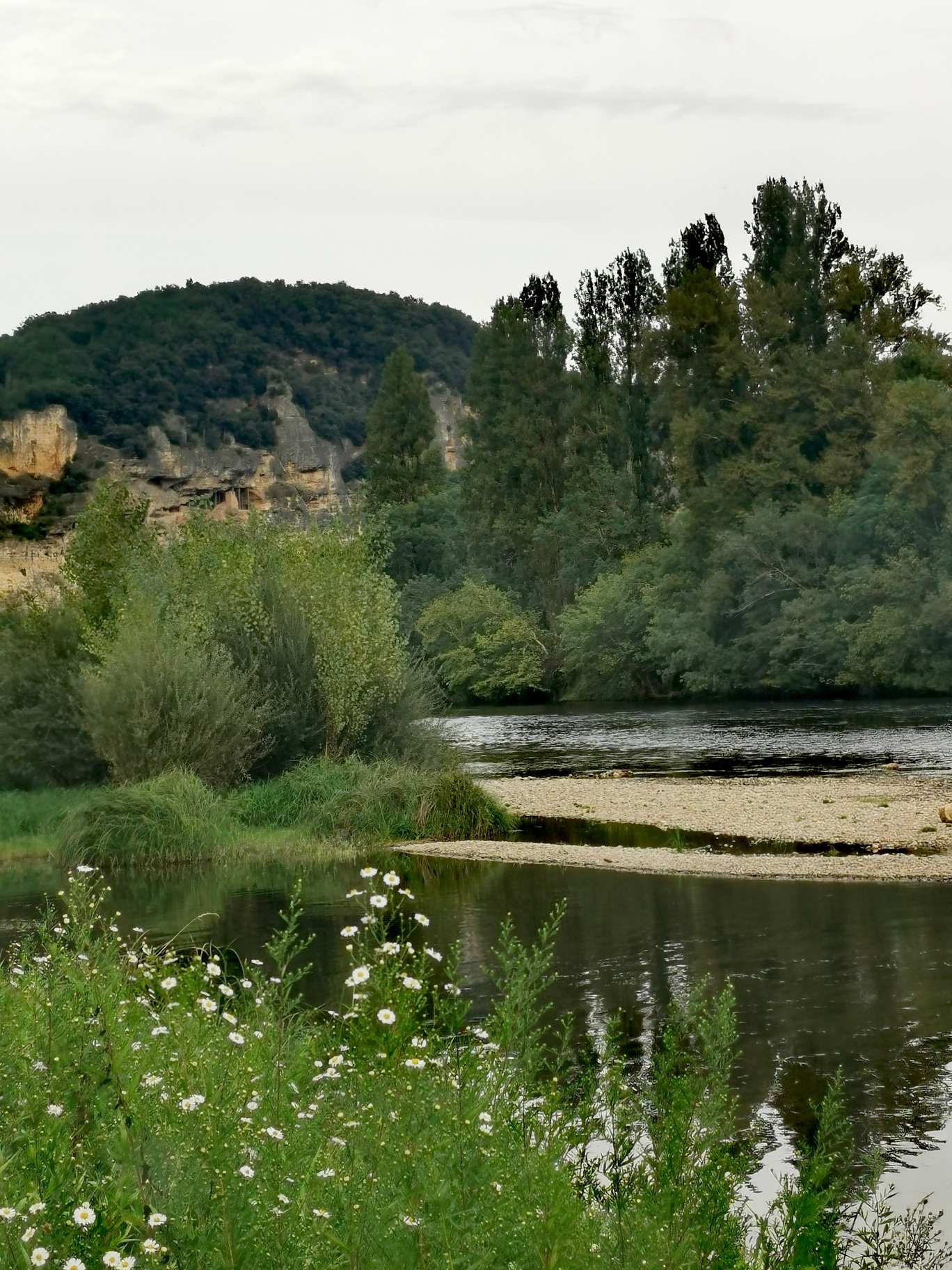 Op zich vinden we het eigenlijk nog wel meevallen met de hitte. Het leek ons gisteren heter. Maar ja, liepen we gisteren nog bergop bergaf door al die plaatsjes met de zon brandend op ons lijf, vandaag zitten we vooral op ons schaduwplekje onder de bomen helemaal niks te doen. En het gaat ons nog goed af ook. Nog wat langs de rivier af wandelen is het sportiefste van de dag. Het waterpeil is al wat gezakt, en een mini strandje komt tevoorschijn. Je moet nog wel een stukje door de rivier om er te komen.