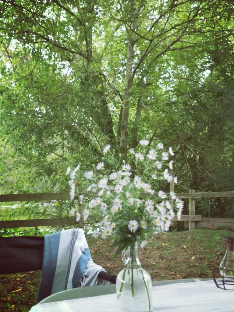 Veel wilde bloemetjes hier overal. Een paar takjes zullen niet gemist worden vermoed ik, en ik recycle er een lege fles mee. Mijn schoonmoeder zal trots zijn op mijn bloemschikkunst.