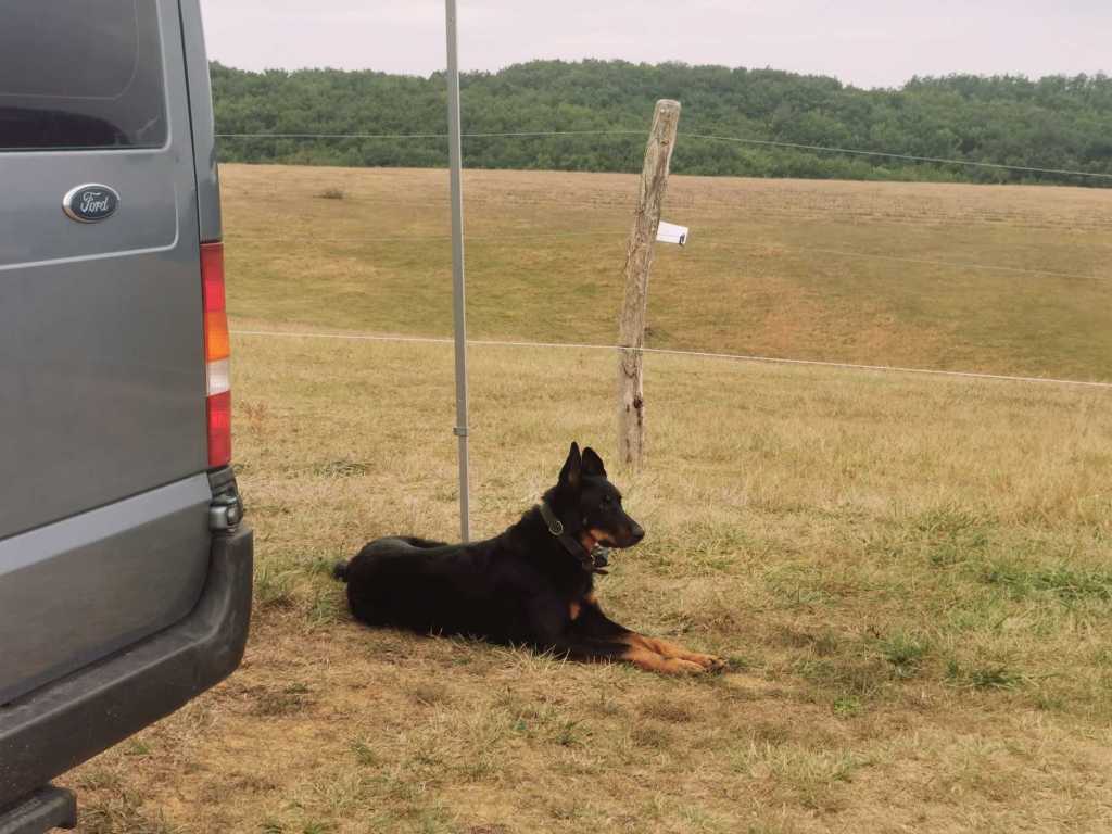 We zitten hier echt afgelegen. Vanaf onze plek heb je een 180 graden panoramisch uitzicht. Het enige huis dat we zien is die van de ezelboerderij. De hond van de boer komt aangelopen. Hij loopt eens rond onze bus, snuffelt wat aan ons, en claimt vervolgens een plekje onder de luifel. We voelen ons veilig nu.