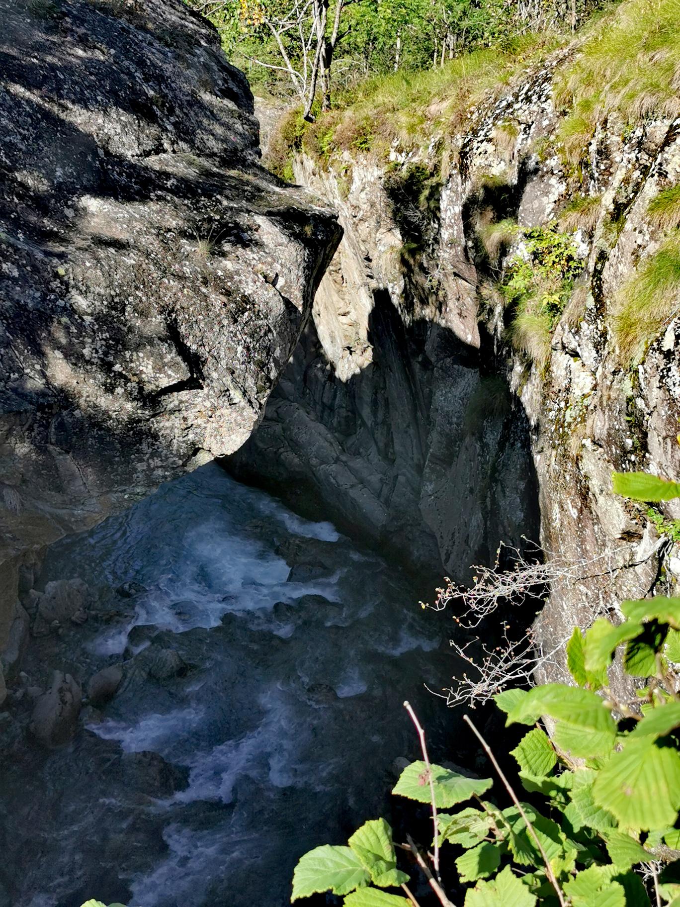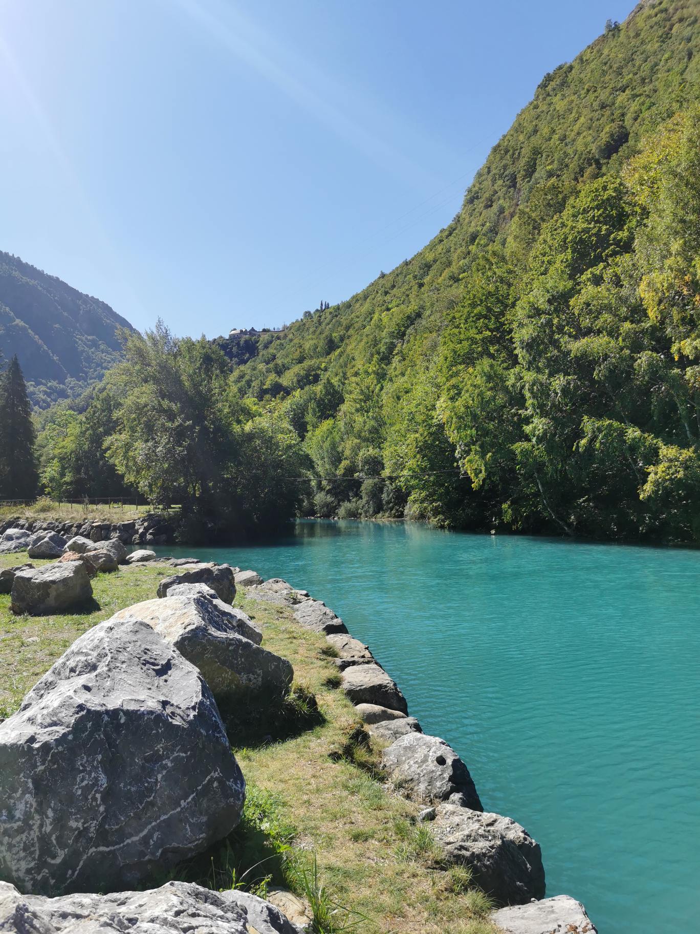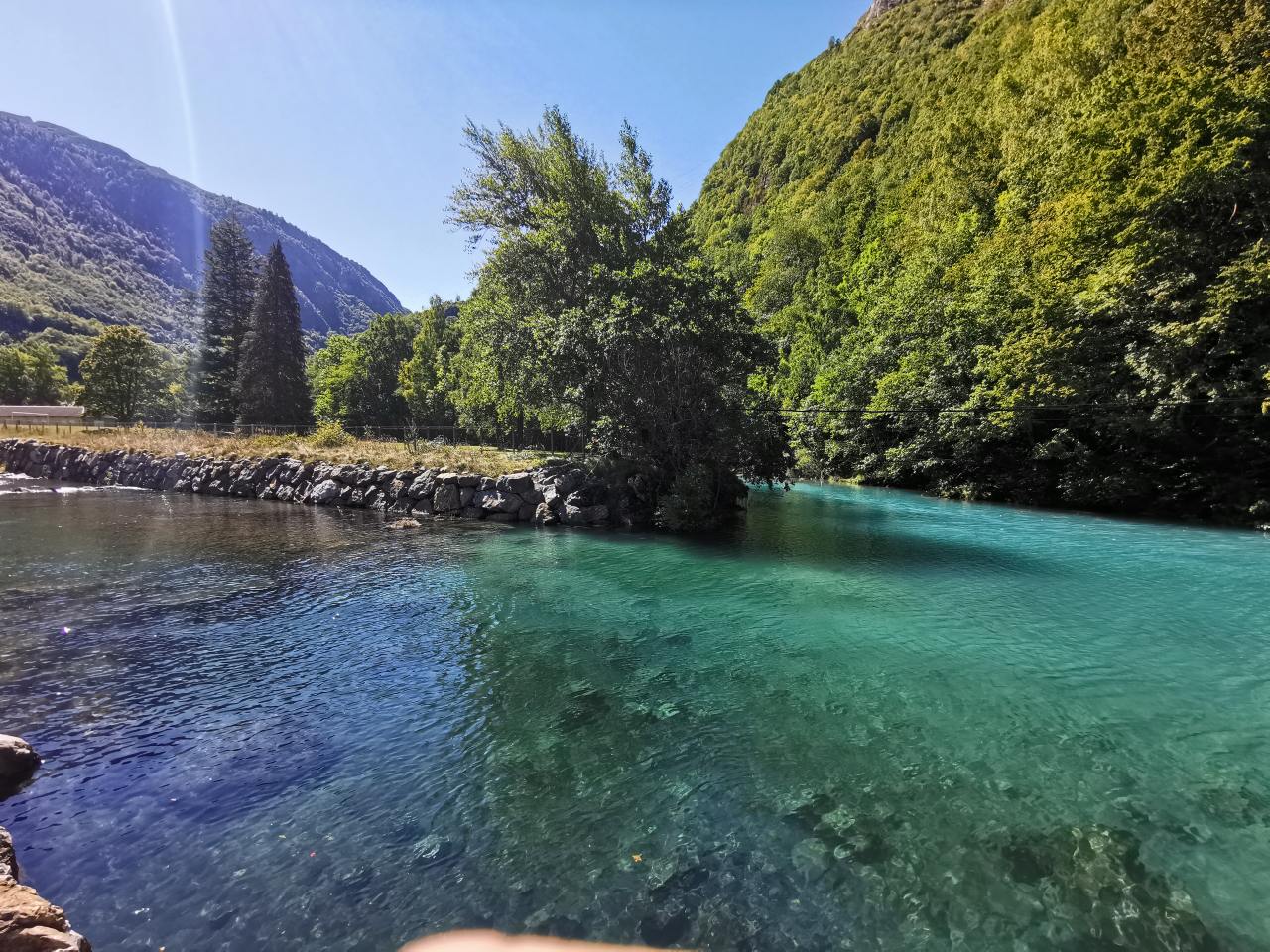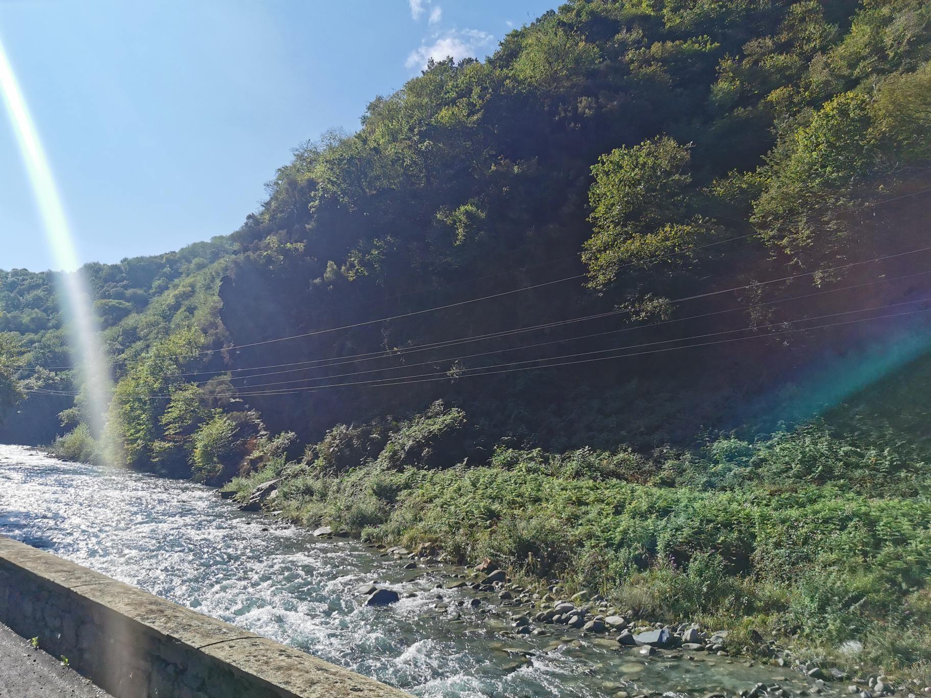 Af en toe een huisje tegen de berg, of een klein dorpje. Een rivier die af en toe vriendelijk glinsterend naast je kabbelt, maar een eind verderop woest doorheen een diepe kloof gaat. Bergtoppen gehuld in mist, en zonverlichte bergtoppen, brugjes, groen en intimiderende rotswanden. En dan ineens is de rivier groen. En blauwig. En turquoise. Hoe ongelooflijk mooi is dat! Wat een onverwacht kadootje. Ik maak, uiteraard, een hoop foto’s. De kleuren zijn echt zo. Ik heb de foto’s niet bewerkt. Had ik al gezegd dat het hier prachtig is?