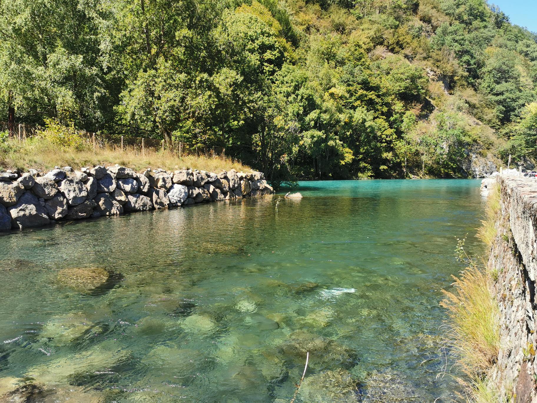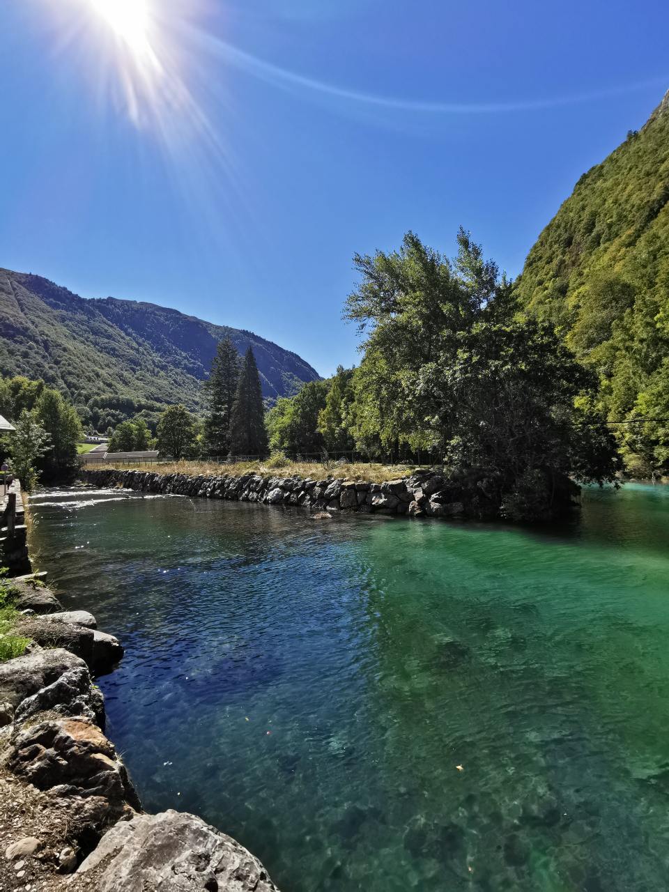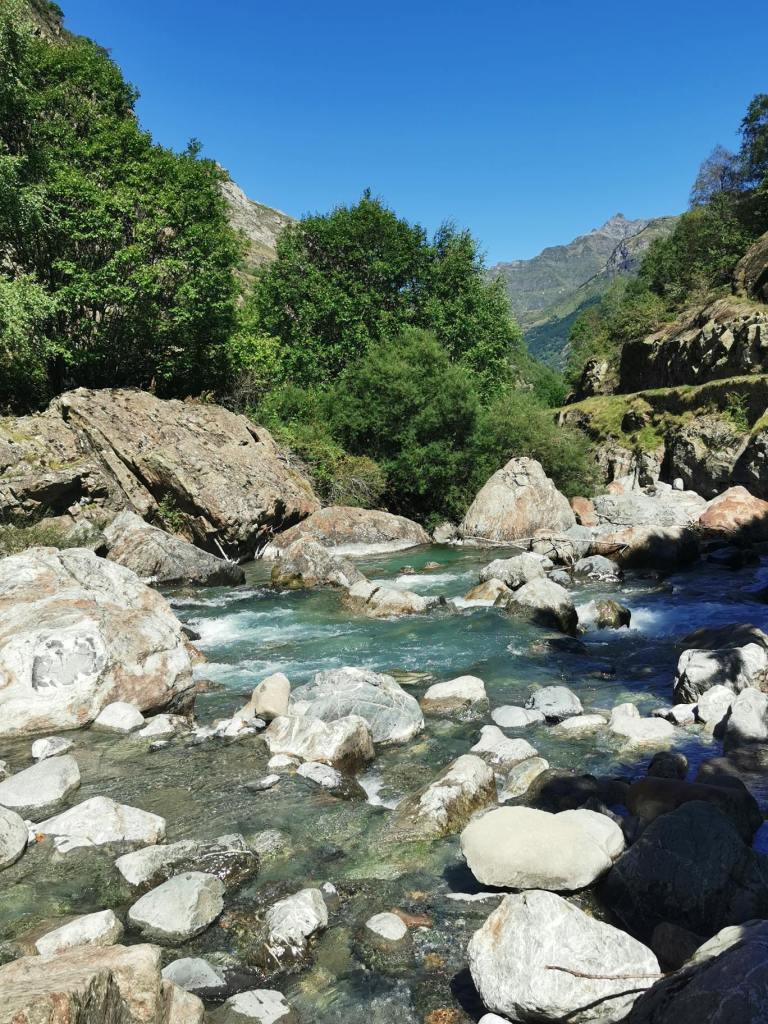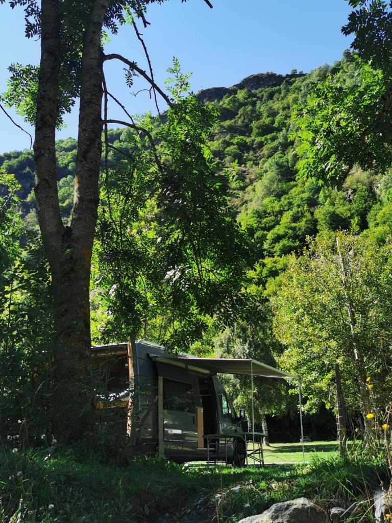 Helemaal aan het eind van deze weg, aan cirque de Gavarnie, is een camperplaats. Hier sta je vlakbij de waterval, en dat was eigenlijk ons plan. Maar de camperparking vinden we niks. Strookje straat, iedereen hutje mutje langs elkaar. Geen stoeltjes buiten. We zijn het beide snel eens dat we hier niet willen staan, en rijden een stukje terug. Daar is een kleine camping, en we staan daar zoveel leuker. Naast de rivier. Tussen de bergen ook. Al kun je hier natuurlijk nergens gaan staan zonder bergen te zien.