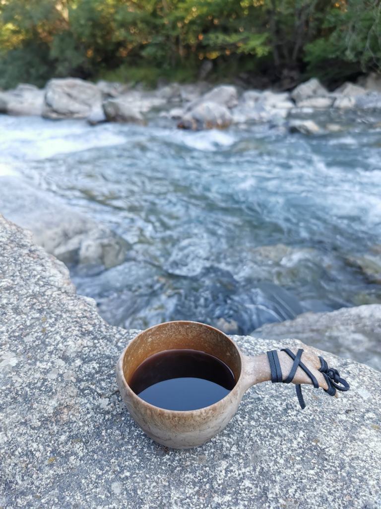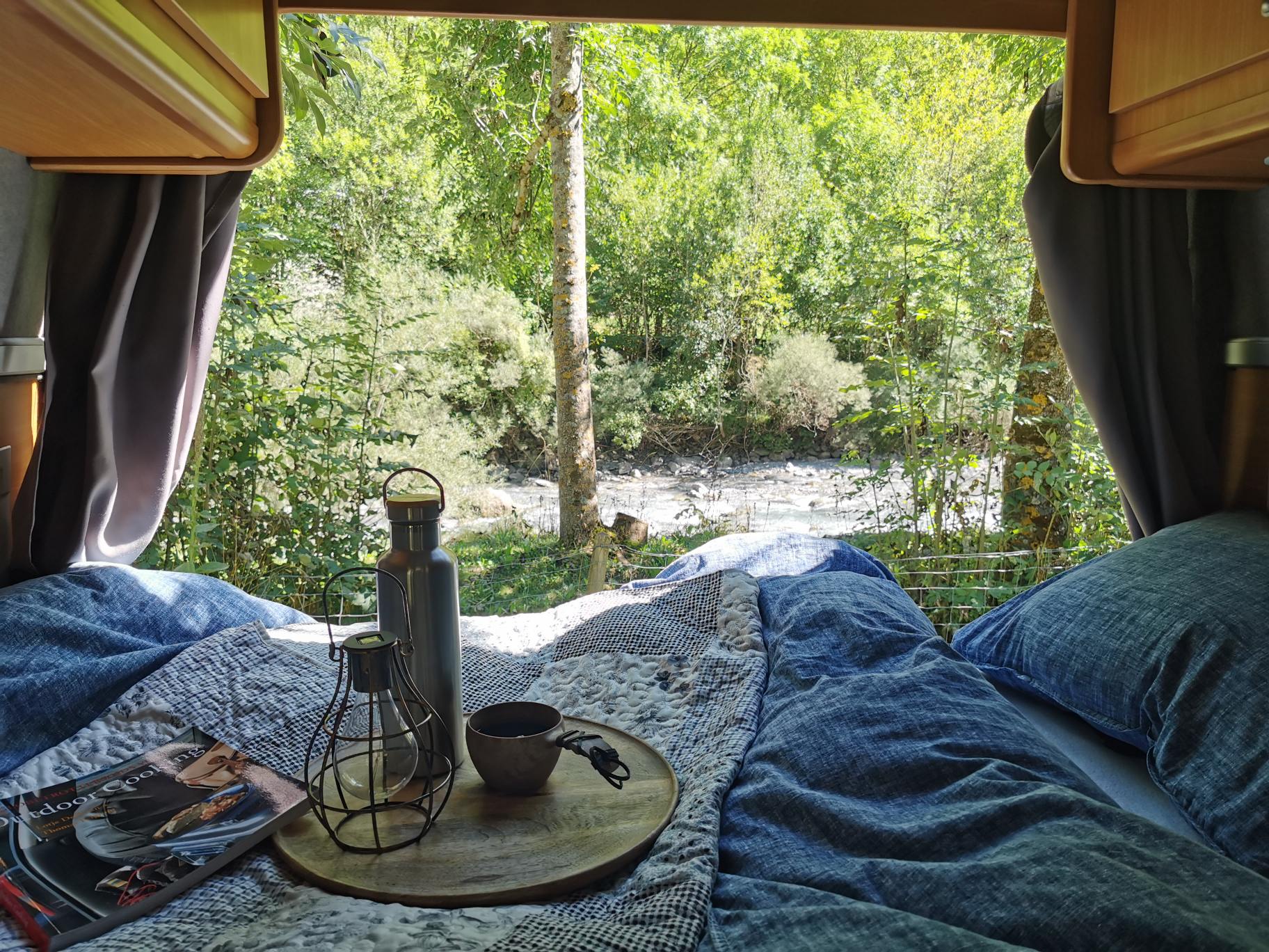 We doen een kleine wandelroute, via een bergbospad tot aan een brugje, waaronder heel diep de rivier stroomt. Via een verlaten, en afgesloten voor verkeer, weggetje wandelen we terug naar de camping. We drinken koffie in de rivier. Ja in. Via de grote rivierstenen kun je zo een stukje de rivier door. En één van zo’n stenen gebruiken we als picknickplek. We wilden hier ook eten, maar vanwege de wind doen we dat toch maar even in de bus. Kaasfondue, koffie, stokbrood en wijn. Zo simpel en zo lekker.