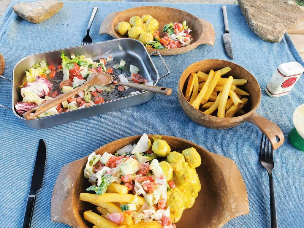 Ik zet m’n intussen onmisbare wonderpan weer op het vuur, en als ie voorverwarmd is doe ik er ovenfrites in. Ik warm boulettes au curry sauce op, (vertaling: bouletten in curry saus) en snijd wat groentes voor in de sla. We beginnen langzaamaan voorzichtig plannen te smeden om ook een foodtruck te beginnen.