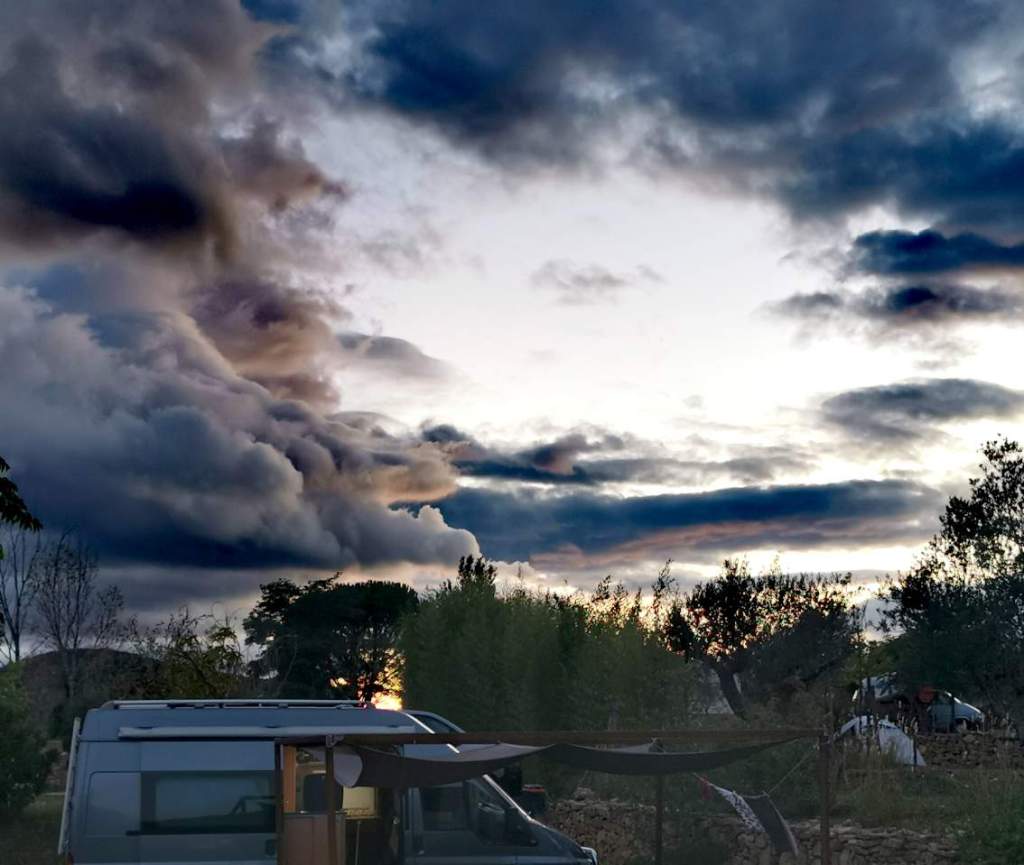 We blijven nog wat buiten zitten, onder ons tuinpaviljoen. Donkere wolken pakken samen boven de berg terwijl de zon langzaam wegzakt, een stevige wind zet op, en wij klemmen onze bekers hete koffie goed in de handen. Tijd om naar binnen te verhuizen. Da’s dan weer het nadeel van pas in september vakantie te hebben.