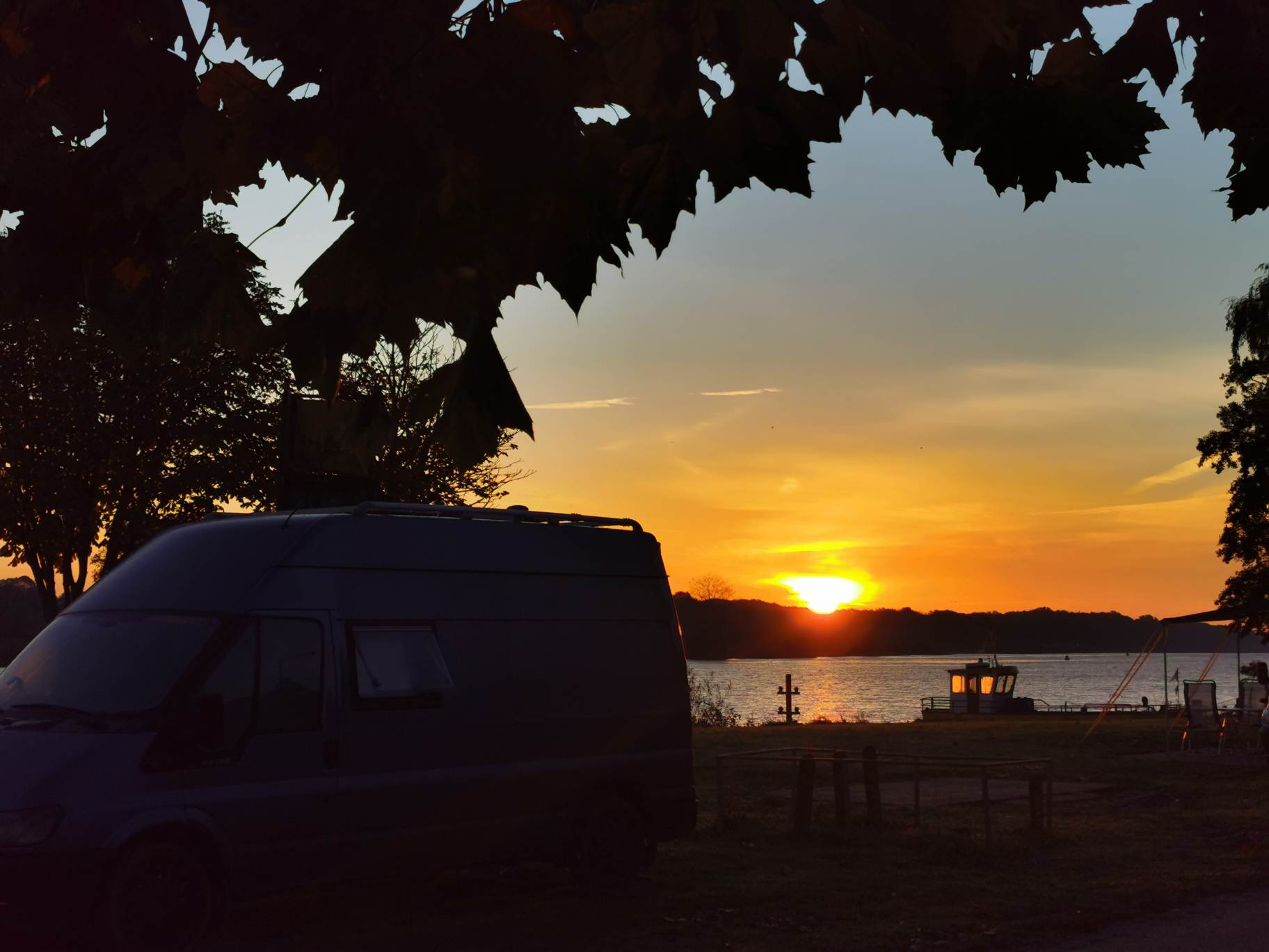 Juist voor de zonsopgang word ik wakker. De lucht kleurt rood, en ik ben meteen klaarwakker. Ik zet vast een fluitketel water op voor de koffie. Het is nu nog fris buiten. De tafel, de stoelen en het gras zijn vochtig van de dauw en er waait een koude bries. De ramen in de bus zijn ook wat beslaan, dus steken we opnieuw de kachel even aan. Buiten, met een jas aan en een beker hete koffie in de handen geklemd, is het genieten van het uitzicht.