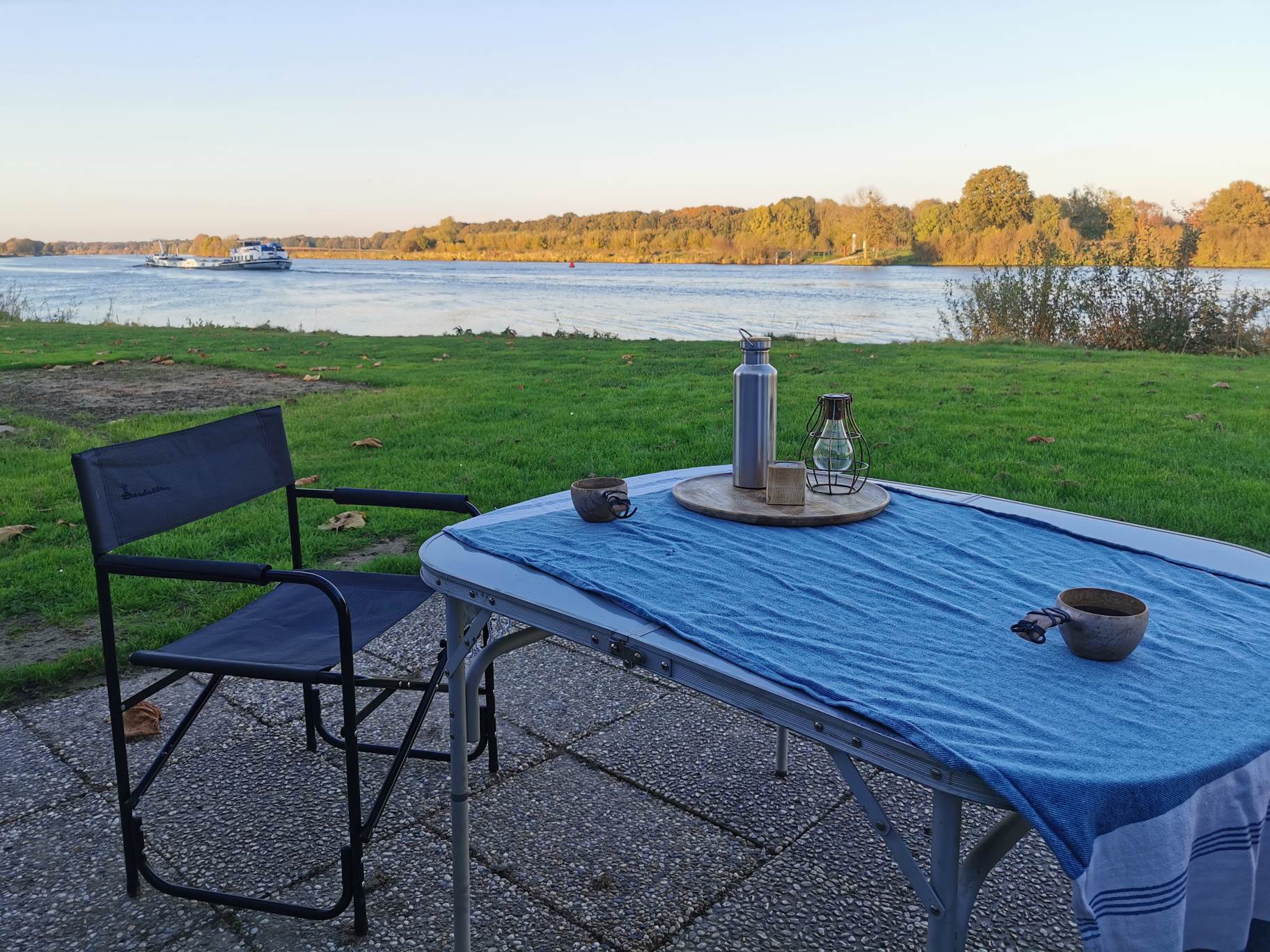 Nog 2 dagen voor de drukte op m’n werk weer begint. Net genoeg tijd om er nog even tussenuit te gaan. Ik moet nog wat kleurtjes bijvullen, dus we combineren de trip naar de groothandel met een overnachting. Het wordt dus Nederlands Limburg. We bellen een camping aan de Maas om een plekje te reserveren. Hier in Nederland hebben ze nog herfstvakantie, dus ik vreesde dat het misschien volzet zou zijn, maar er was plek zat. In de late middag installeren we ons op de aangewezen plek. De meeste plaatsen zijn leeg. Hier en daar staat nog een camper of caravan. Op iedere plek is een stoepje gemaakt wat dient als terras. Rond deze tijd van het jaar is dat zeker wel luxe. De zon schijnt, het uitzicht is mooi, en natuurlijk starten we met koffie.