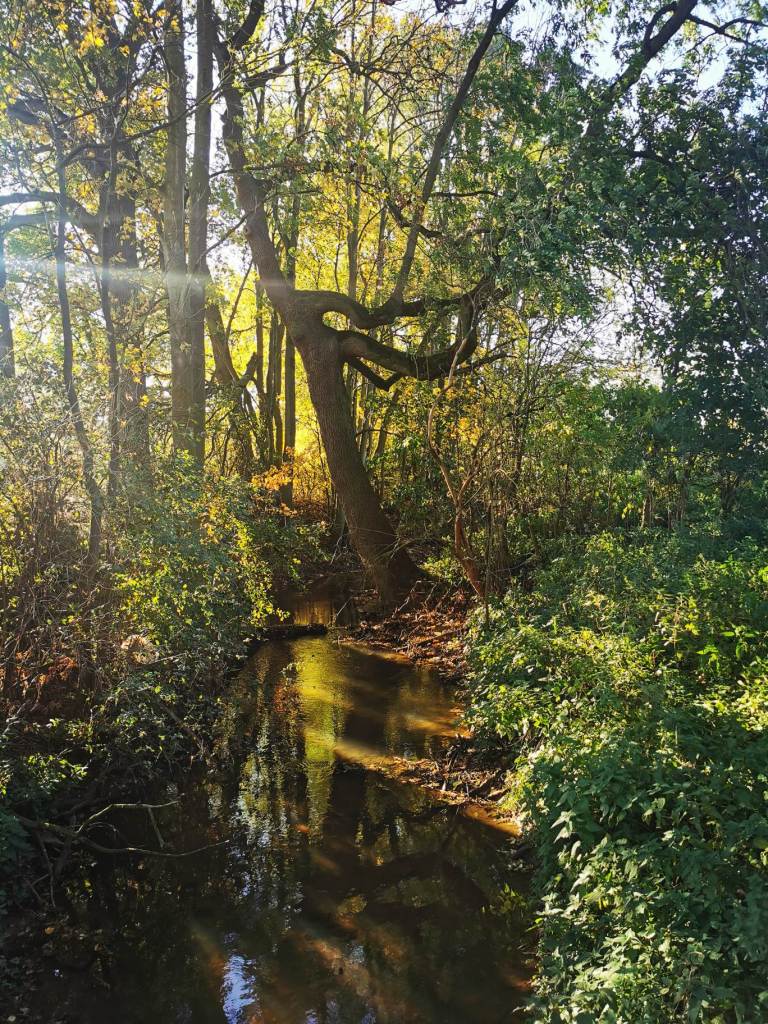 Via kleinere wegen en dorpen rijden we alvast een stukje richting huis. We stoppen bij een parkeerplaats in een bos, drinken een koffie (ja alweer) en volgen een bewegwijzerde wandeling van zo’n 5 kilometer. Tussen de bomen is het een stuk minder fris dan aan het water, dus de jas mag al snel weer uit. Op de plattegrond leek de route interessanter dan dat ie in werkelijkheid was. De wateren die je onderweg meermaals zou passeren bleken maar minieme slootjes te zijn. Maar soit, de herfstkleuren, de zon en de paddenstoelen maakten dat weer goed.