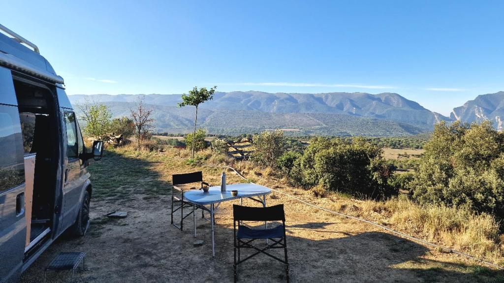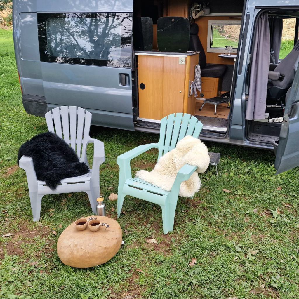 “Buiten natuurlijk”, antwoord ik op de vraag waar we onze koffie gaan drinken. Met 2 strandstoelen van de boer, en 2 schapenvachten uit de bus installeren we ons met zicht op de paardenwei. De paarden hebben allemaal een bel rond de nek, waardoor het klinkt alsof we tussen de schapen zitten. Als mijn hoogte-app een beetje correct is, dan zitten we hier op bijna een kilometer hoogte. Het is koud, heel koud. We klemmen onze bekers stevig tussen 2 handen, om het zo een beetje warmer te krijgen. De weer-app zegt dat het nu 6 graden is, en een gevoelstemperatuur van 3 graden.