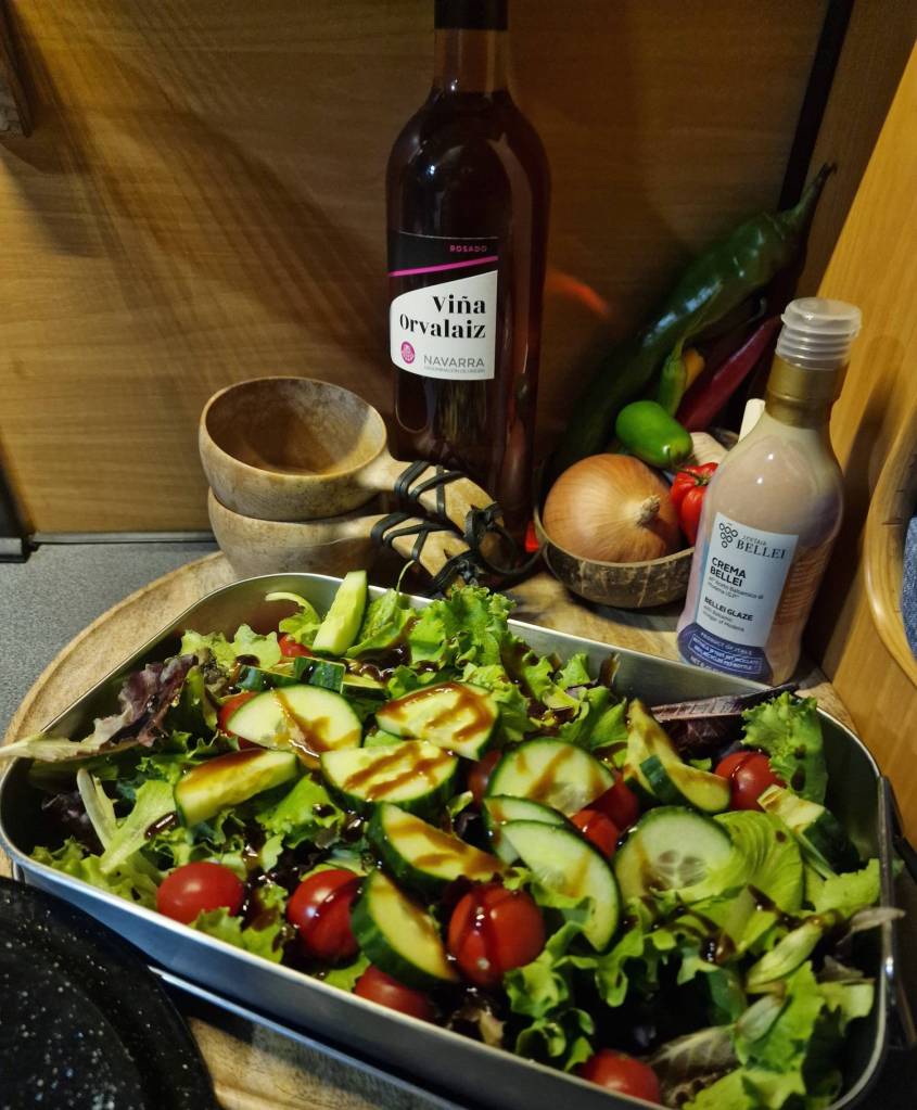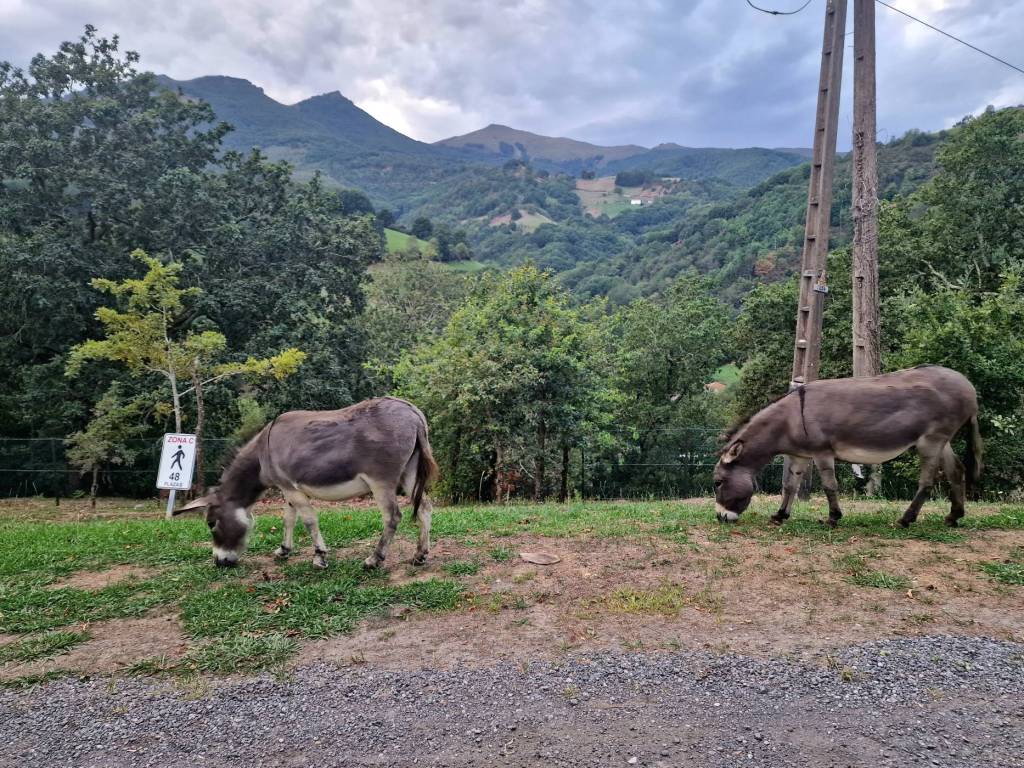 Vroeg in de avond passeren we dan eindelijk de Spaanse grens, in de regio Navarra. We vinden moeiteloos de camping, en ook hier mogen we zelf een plaatsje gaan uitzoeken. Er zijn nog genoeg lege plekken. We settelen ons op een lege strook met uitzicht op de bergen. De ezeltjes komen eens kijken, maar grazen daarna weer rustig verder.