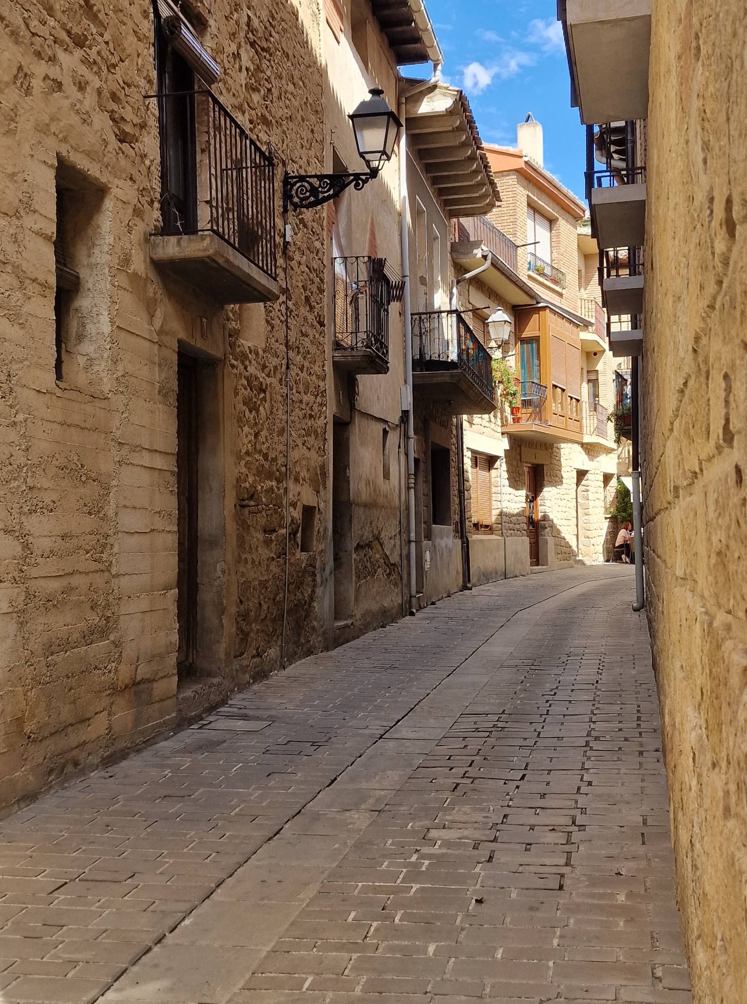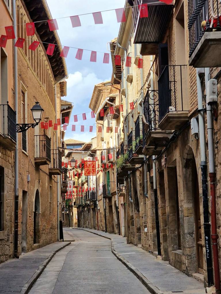 Het is een piepkleine supermarkt, maar vanwege diezelfde feesten ook een paar dagen gesloten. Het wordt hier wat minder uitbundig gevierd als in Olite, maar toch ook weer roodwit geklede mensen en verlaten steegjes.