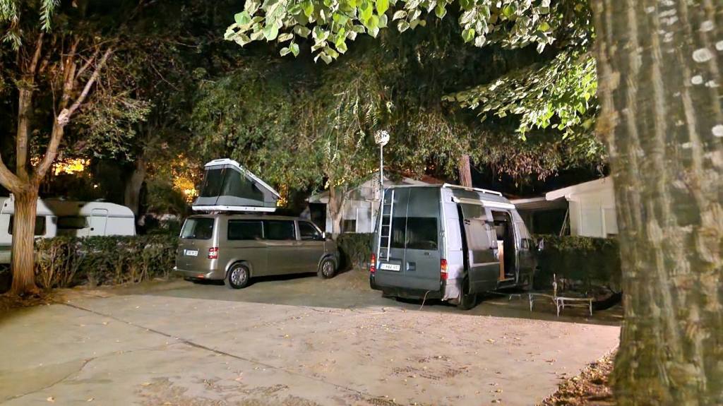 Tegen 21 uur melden we ons bij de receptie op de camping. “Sorry, helemaal vol”. Hij moet de teleurstelling hebben gemerkt, want hij vervolgt in half Spaans / half Engels dat ie misschien nog ergens een plekje weet, voor één nacht, waar hij ons eventueel nog tussenin kan proppen, als we geen te grote camper hebben. (vrije vertaling) We antwoorden dat we echt maar een héél klein busje hebben, en we lopen met hem mee om de plek te bekijken. Het is een verschrikkelijk drukke camping. De campers en caravans staan dicht op elkaar, en tussendoor ook nog saaie verhuurhuisjes. Dit is het soort camping dat we normaal gezien vermijden. Vandaag zijn we blij dat ie ergens achteraan nog één open plek heeft. Te nemen of te (ver)laten. We nemen ‘m. Het blijkt, in vergelijking met de rest, zelfs nog een van de royaalste plekken te zijn.
