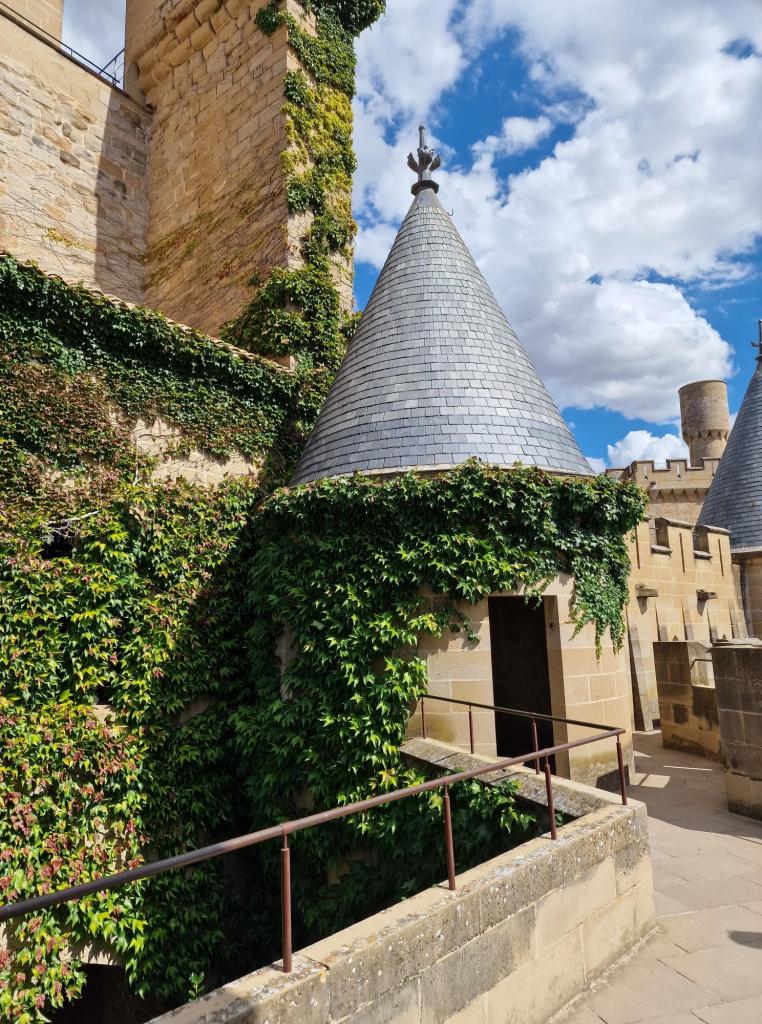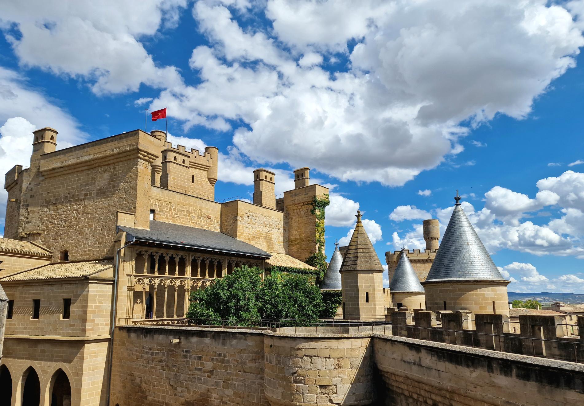 Olite. Een klein stadje met een prachtig middeleeuws uitziend centrum. Er zijn terrasjes, winkeltjes, een kleine supermarkt, en we kunnen er ’s avonds een hapje eten. Dan overnachten op een camperparking en van daaruit de volgende dag door naar een natuurpark in de regio. Ik heb het goed geregeld. De wegen zijn leuk om te rijden, het uitzicht is bijna overal natuur, soms groen soms dor, een dunbevolkte regio. Moeiteloos vinden we Olite, en we parkeren aan de rand van het stadje.