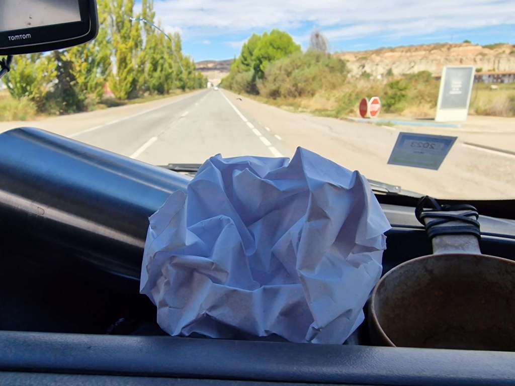 Met onze zorgvuldig uitgeschreven planning bij de hand, rijden we de camping af. Ondertussen stel ik de navigatie in. Het plaatsje vindt ie niet, maar geen nood, ik heb nog coördinaten. Maar hoe ik ze ook invul, en opnieuw, en lichtelijk aangepast… het lijkt op geen enkel ogenblik op de afstand of de route die we gisteren uitgetekend hadden. Plaats A slaan we dan maar over, tegenvaller. Gelukkig hebben we een plan B en C.