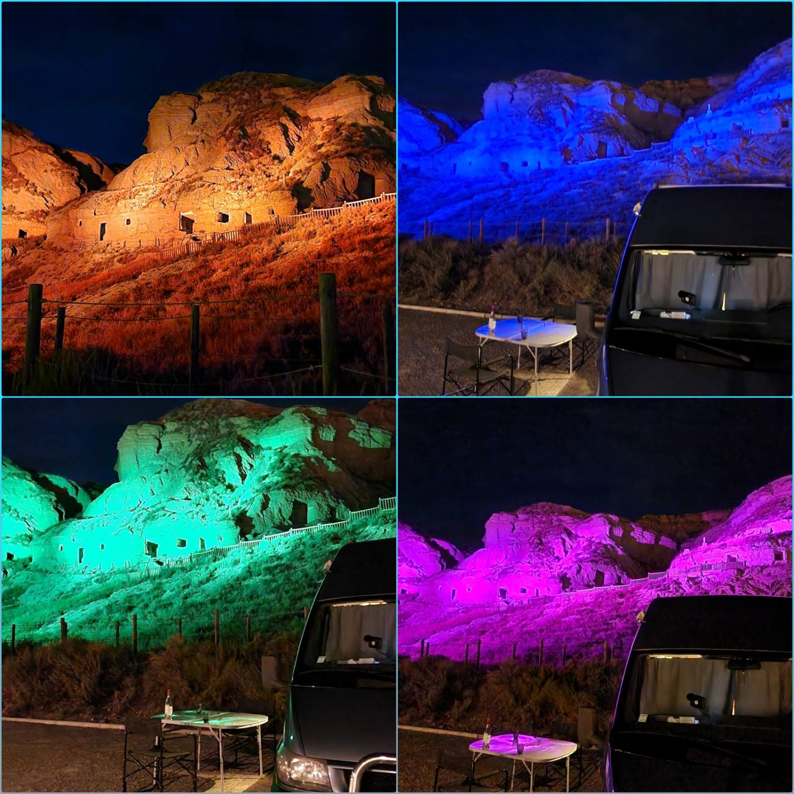 Als de zon onder is begin ik aan het avondeten. Juist als we buiten gaan dineren, worden er gekleurde spots gericht op de berg. Dinner at cavelight, tis weer eens wat anders.