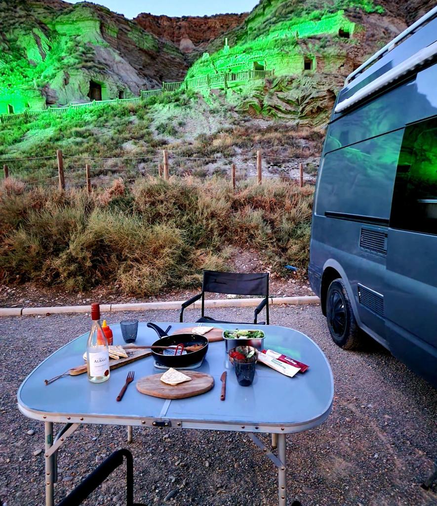 Rond half twee rijden we de camperplek op. Het is gewoon een strook grind, waar je gratis mag overnachten, maar het decor is fantastisch. We staan aan de grotwoningen van Arguedas. Er zijn heel veel van deze woningen, maar er is maar een beperkt gedeelte te bezoeken. Vroeger woonden hier mensen die zich geen woning konden veroorloven. Voor we aan de niet zo lange klim naar boven beginnen, zetten we eerst onze stoeltjes in het reepje schaduw naast de bus. Puffend en zwetend, wachtend tot het heetst van de dag voorbij is. We snappen dat ge-siësta van de Spanjaarden wel.