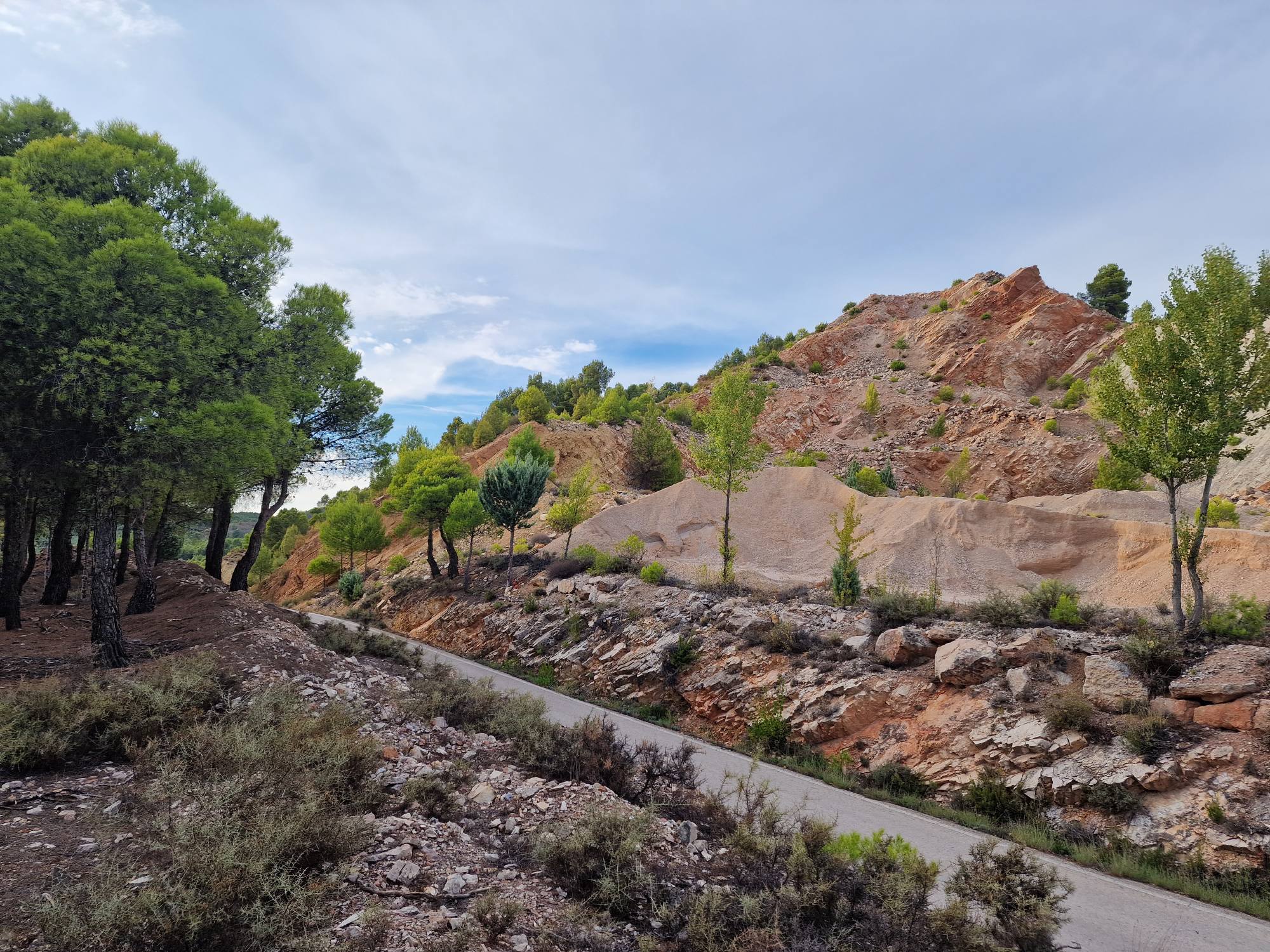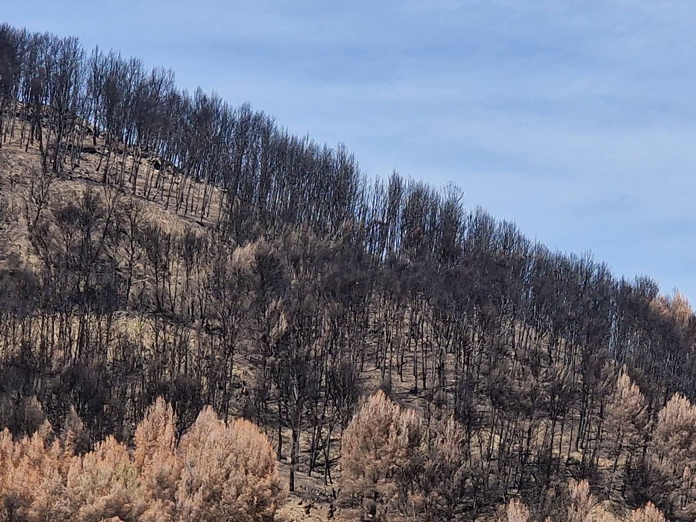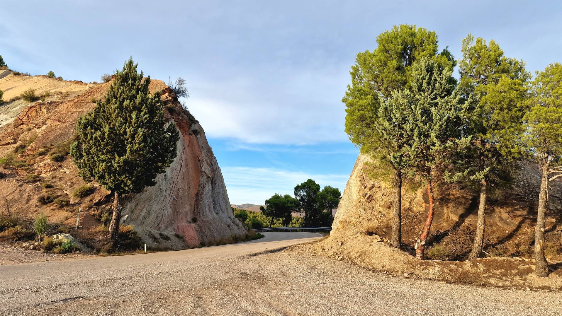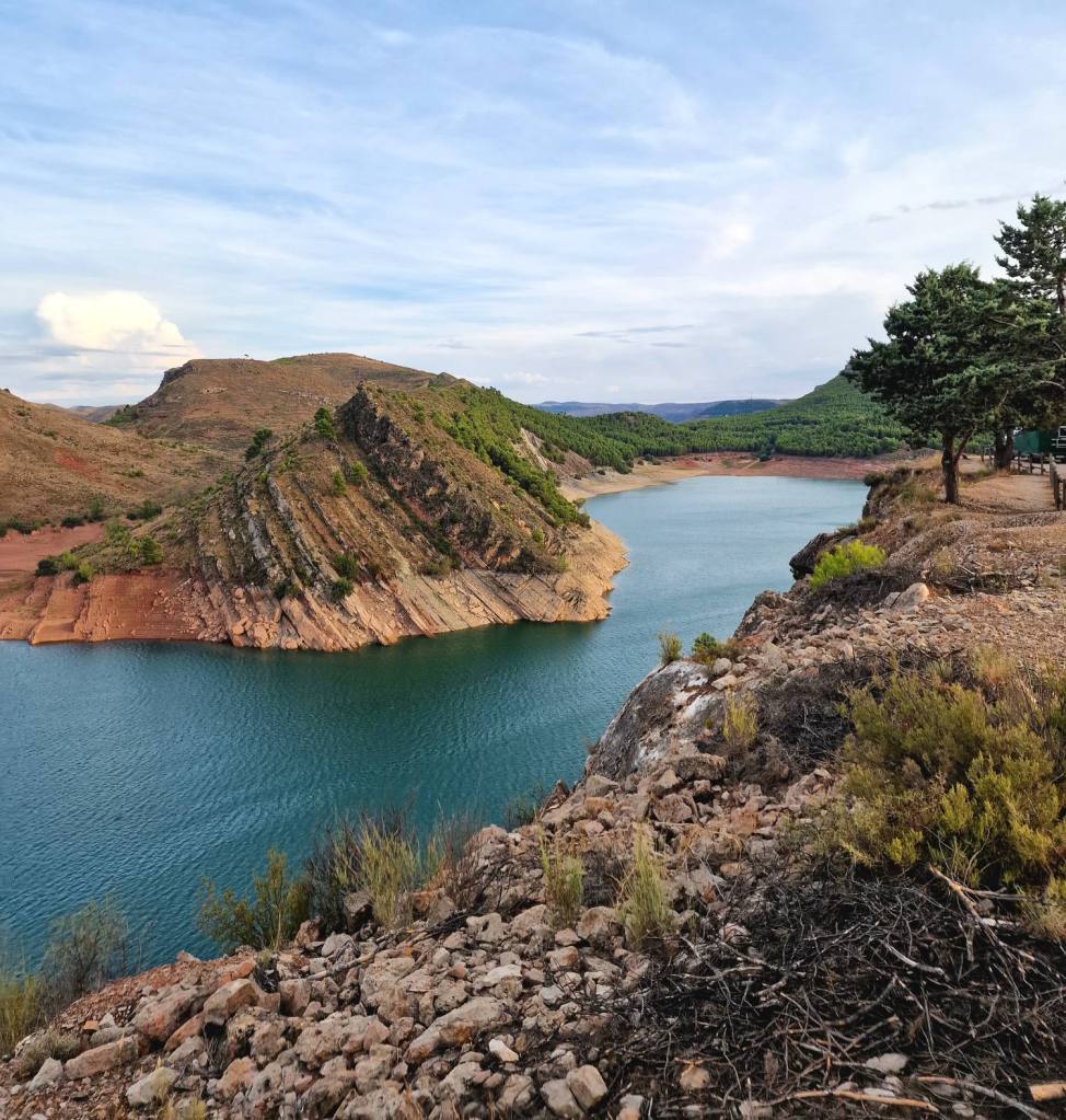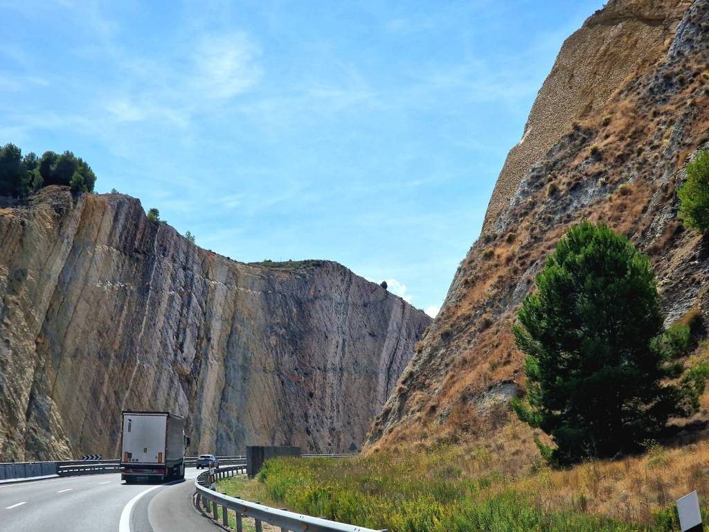 Onderweg naar de volgende bestemming staar ik wat uit het raam en neem de omgeving in me op. Net als ik beslis dat ik Aragón niet zo fascinerend vind als Navarra, laat de regio zich plots van een andere kant zien. De weidse platte, en daardoor soms wat saaiere, uitzichten hebben plaats gemaakt voor ruigere rotsige kloven en ravijnen. Na bijna iedere bocht lijkt het landschap weer te wisselen. De droogte is wel overal zichtbaar, en zal hier regelmatig natuurbranden veroorzaakt hebben. We passeren verschillende bergwanden met zwartgeblakerde bomen. Al rijdend probeer ik wat foto’s te maken, (als passagier uiteraard, ik zit niet aan het stuur) stoppen doen we nu niet.
