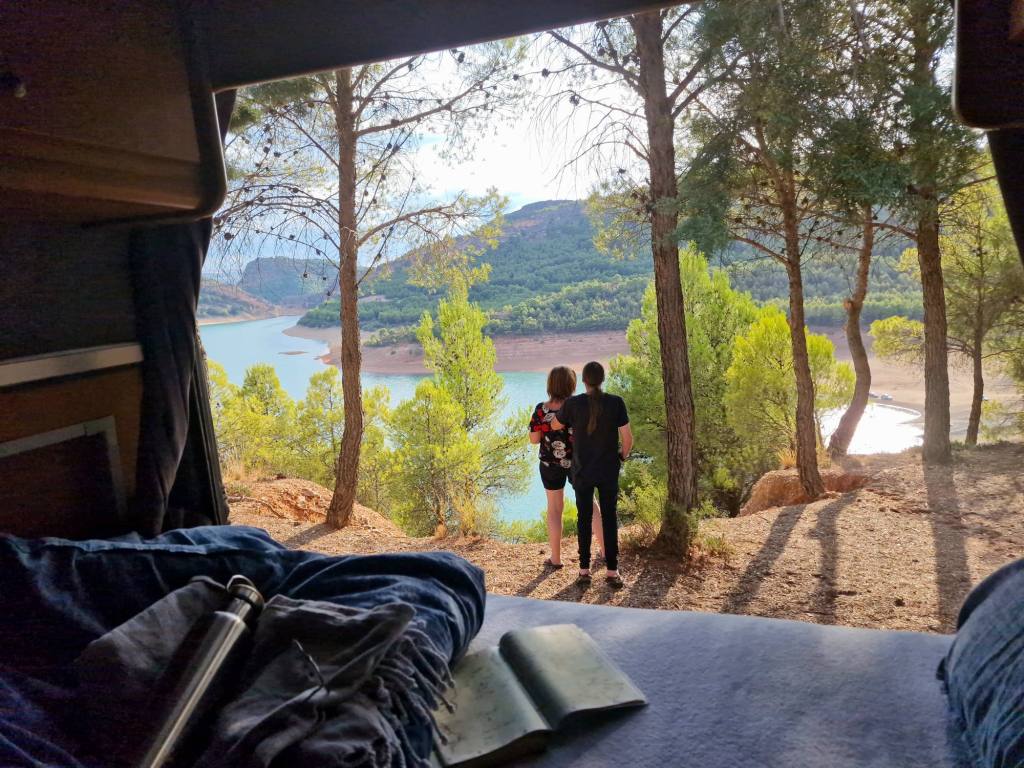 De achterdeuren van de bus wijd open, en de stoelen op het plekje schaduw daar. Wat een prachtige achtertuin hebben we! Ons bed als bar. Met een drankje en een zak nacho’s is het hier best goed uit te houden zo. We kijken uit op een blauwgroen water. De zon zorgt voor duizenden dansende sterretjes over het water. Het strand rondom is op een enkeling na verlaten. In de verte kabbelen een paar kano’s. Het voelt alsof we middenin een ansichtkaart terechtgekomen zijn. Zo’n kaart die je vroeger verstuurde als je op vakantie was. Met ‘groetjes uit….’.