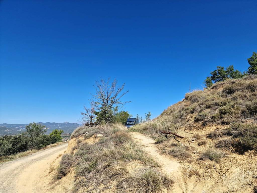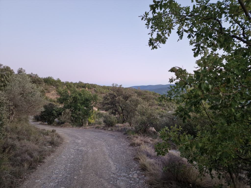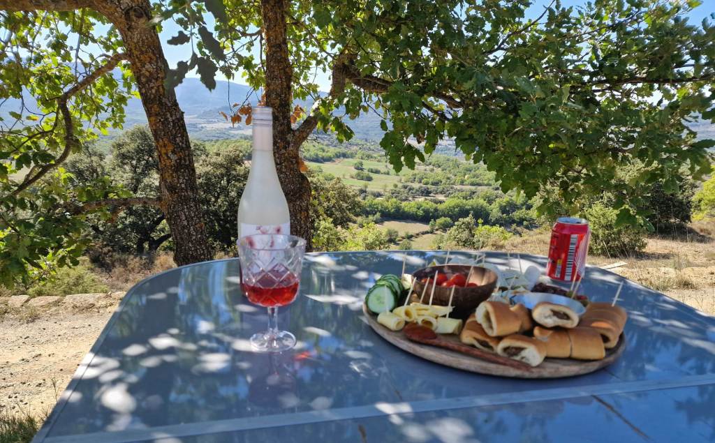 We drinken onze koffies terwijl we naar beneden kijken. Als ontbijt zaag ik het 3 dagen oude stokbrood in stukjes. Besprenkel het met een beetje olijfolie, beleg het met wat kaas, en steek het in de wonderpan. Het smaakt weer als nieuw. Bijna dan toch. We hebben haast geen voorraad eten meer, wel een noodrantsoen. Misschien is dit dat moment? Of rijden we verder, en stoppen we onderweg bij een supermarkt? Allebei vinden we het wel zonde om al te vertrekken. Een dagje hier op deze berg is ook wel relaxed. Wel duur, maar vooruit, we hebben maar één keer zomervakantie per jaar. En er is een huiskamer, keukentje en terras wat je mag gebruiken, naast een kleine bar-restaurant. Kunnen we ook daar dan iets gaan eten of afhalen, de menukaart ziet er goed uit, en het terras is gezellig ingericht, en uiteraard met hetzelfde mooie uitzicht. We wandelen naar het gebouwtje waar de eigenaar is en boeken een nachtje bij. Helaas is het geen hoogseizoen meer dus z’n bar is dicht vanavond. Een fles water, fris of wijn kunnen we wel kopen. Met een koude fles wijn wandelen we weer naar de bus. Het zal een hele goeie zijn, het kost hier 3x meer dan in de supermarkt. Maar naar de winkel is vandaag geen optie. We moeten rekenen op zo’n 40 minuten rijden naar de dichtstbijzijnde winkel. Een weg waarvan we die eerste 6,5 kilometer al kennen, dus dat gaan we niet doen. We hebben niet voor niks een noodrantsoen mee.