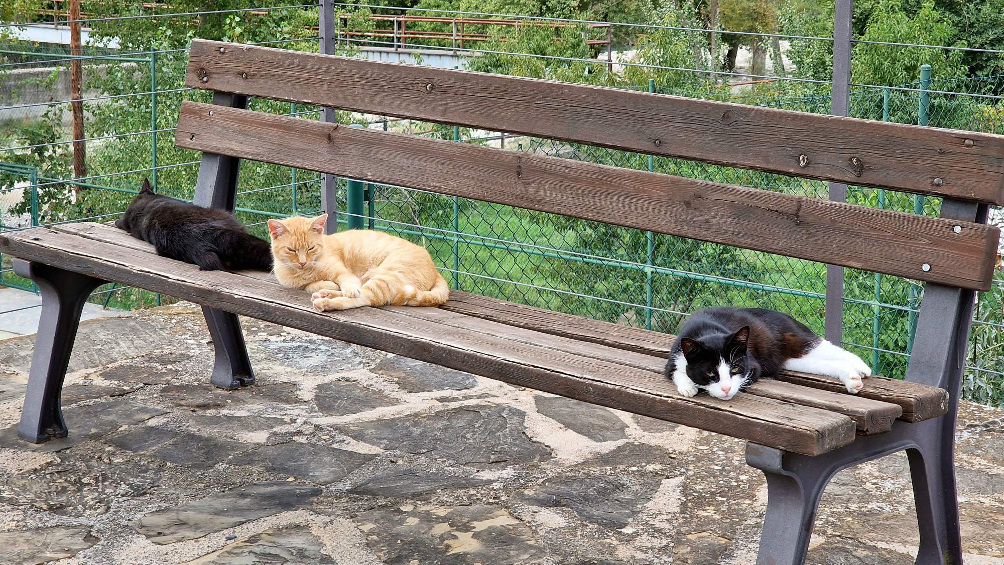 Vroeg in de avond zoek ik een plek uit op de bekende app. Het ligt, als ik het goed begrepen heb, precies tussen 2 plaatsen in die we de komende dagen nog willen bezoeken. Komt mooi uit. Het is een gratis camperplaats in een klein oud dorpje. We verwachten er niet veel van, maar meer dan een slaapplek hebben we nu in principe niet nodig. Maar juist als je het niet verwacht is de verrassing des te groter. Aan de rand van het dorp, naast de laatste (en enige?) bar in het dorp is een grote plek voorzien. Vanaf daar houden de huizen ook op en heb je een weids uitzicht. Je kunt grijs en zwart water lozen, je kunt drinkwater tappen. In de avond branden er enkele lantaarns. Je mag hier zelfs je stoelen en tafel buitenzetten, en het kost niks. Wat boffen we weer. We wandelen eens door het dorpje, wat er wat verlaten bijligt. Toch heeft het wel iets charmants. We vinden dat we minstens ergens iets moeten gaan drinken hier. We komen bij onze buur de bar terecht. Het lijkt meer op een kantine van een of andere vereniging. Er staan enkele tafeltjes en stoelen, er is geen menukaart te bespeuren, en het is ons ook niet helemaal duidelijk wat er eigenlijk te verkrijgen is. We gokken dat ze een cola en een koffie wel zullen hebben. Even later zitten we aan onze cola en koffie. Aan een ander tafeltje zit een jong gezin. En de rest van de tafels wordt in beslag genomen door een groepje bomma’s die bingo’en met een biertje in de bar. We verstaan er niks van, maar ze hebben het duidelijk naar hun zin.