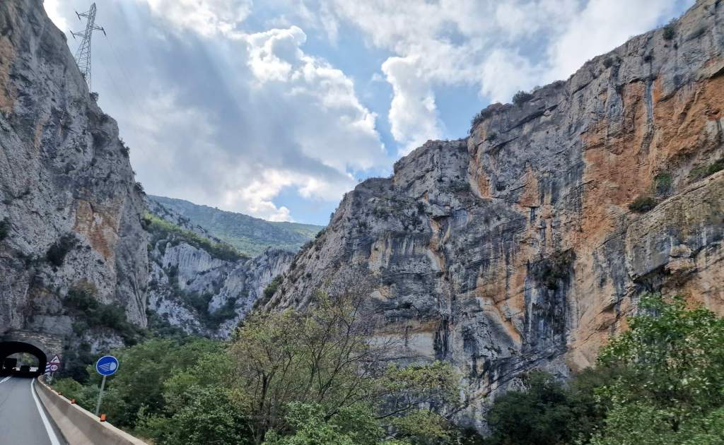Alweer dat fantastische uitzicht als we opstaan. Met het enige verschil dat het nu geen strakblauwe lucht is, maar eentje met een gemoedelijk wit wolkendek. Het is een paar graden frisser dan gisteren maar, zeker voor ons, nog warm genoeg. Nog even ontbijten in dit decor, en dan is het weer tijd om in te pakken. Hoe tof het hier ook is, het is wel serieus overpriced. Eigenlijk is het enkel het uitzicht wat het voor ons de moeite maakte. Met een gesloten terras/bar/restaurant, de toiletten en douches in een container, geen mogelijkheid om grijs water te lozen en kraanwater aan te vullen, is 35 euro per nacht in het laagseizoen echt wel teveel. Maar bon, ’t is vakantie.