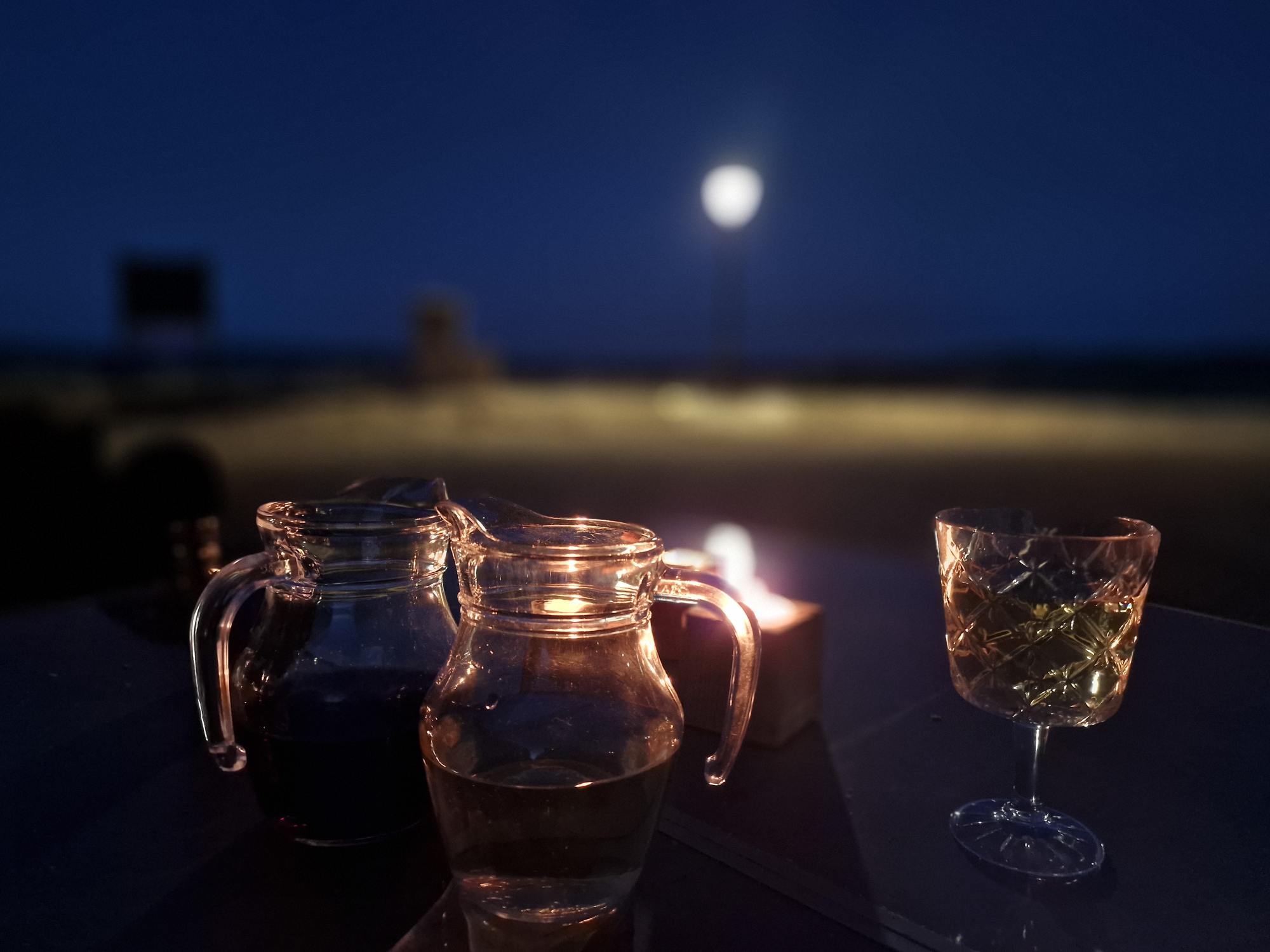 De zon gaat onder. Helemaal volgens het Spaanse ritme beginnen we laat aan het avondeten. Een simpele kaasfondue met wat stokbrood en groente, en ieder een klein karafje wijn. (Luc leert wijn drinken, en hij leert verrekte snel ;))