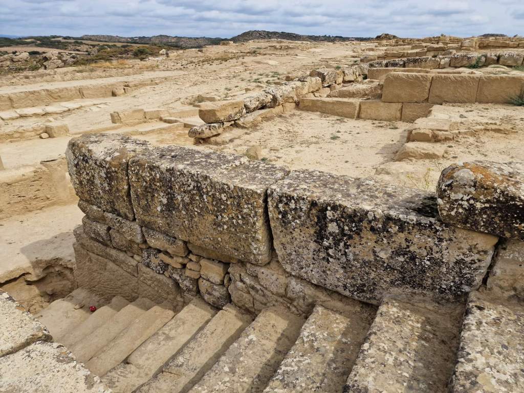 Een Spaanse auto stopt bij ons, ziet ons Belgisch nummerbord, en probeert in zijn beste Frans uitleg te vragen over een nabijgelegen Romeinse site. Ons Frans is ongeveer even goed als ons Spaans, dus hij gaat uiteindelijk maar elders informeren. De site blijkt ongeveer een kilometer rijden te zijn, dat komt ie ons nog melden als ie weer passeert, op weg er naartoe. Nog geen kwartiertje later rijdt ie weer voorbij, en claxoneert naar ons. Dat was snel, het zal niet echt de moeite geweest zijn? Na de ochtendrituelen pakken we in om verder te trekken. Toch nieuwsgierig naar die Romeinse site doen we dat eerst nog even. We begrijpen niet alles op de borden met uitleg, maar het moeten restanten zijn van een hele stad van meer dan 2000 jaar geleden. Niet enkel in dit dorp hebben archeologen dat ontdekt, ook in enkele andere dorpen in de buurt. Het idee dat wij rondlopen op restanten die echt in die tijd gebouwd zijn, is wel apart. Maar verder vinden we het ook weer niet zó interessant, dus na een korte wandeling stappen we weer in de bus.