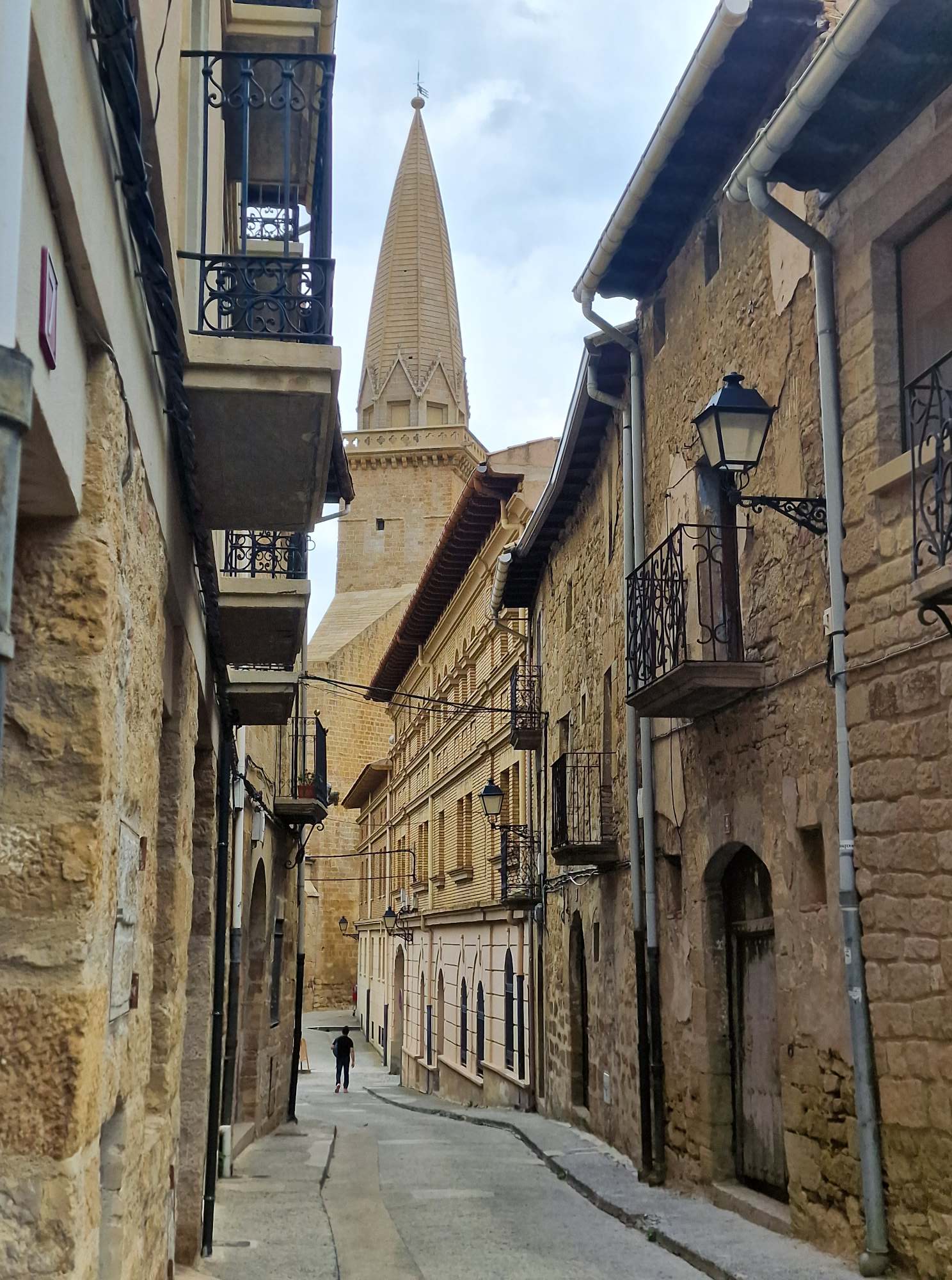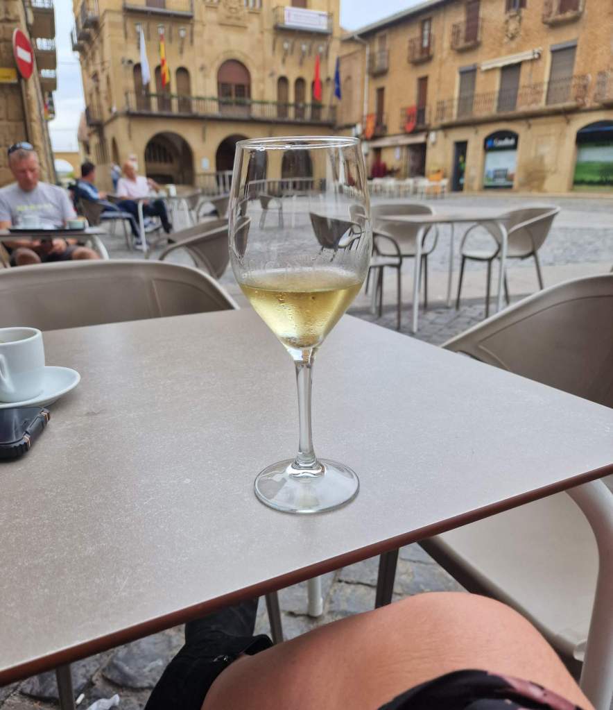 We zetten het plaatsje Olite nog eens in de navigatie. Dat hebben we al eens bezocht, maar vanwege de plaatselijke feesten hebben we toen niet echt rond kunnen wandelen, op het kasteelbezoek na. Nu gaan we Olite, een mooi oud stadje, zelf bezichtigen. Ik vind het een beetje het Durbuy van Spanje. Alweer hebben we wat verkeerd getimed. We moeten eens onthouden dat siësta hier op sommige plaatsen nog heilig is. De winkels zijn dicht, de steegjes verlaten, en alleen een enkel terras is open. Dan maar eerst een drankje. Ik schrik van de rekening. Het is €2,60, voor een koffie en een glas wijn. Daar heb je bij ons maar net de koffie voor.