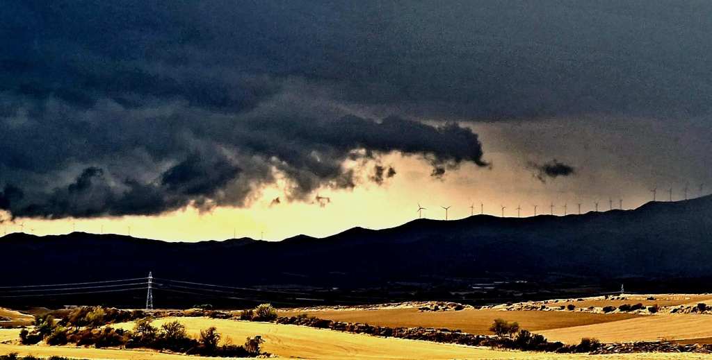 Er is een camperparking in Olite, waar we de bus hebben staan, maar we hebben geen zin om hier ook te overnachten. Die echte parkings zijn niets voor ons. We zoeken een camping uit in de richting van de volgende plek die we morgen willen gaan bezoeken. Onderweg wordt de lucht steeds donkerder, en de wolken hangen dreigend boven de bergtoppen. Enkele bliksemflitsen en dikke regendruppels maken het plaatje compleet.