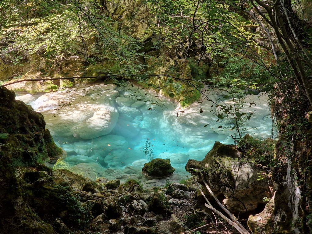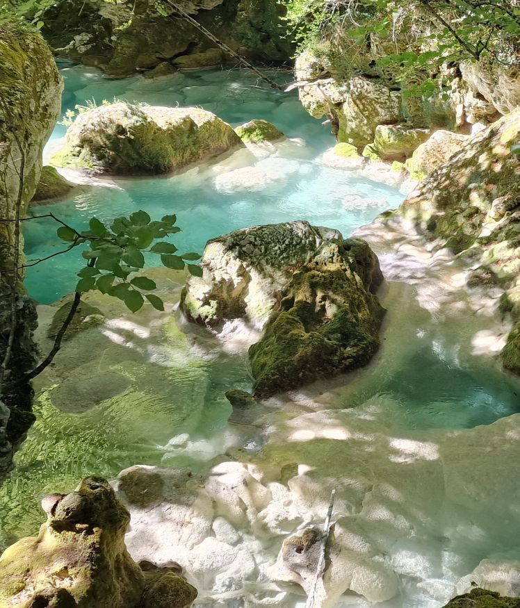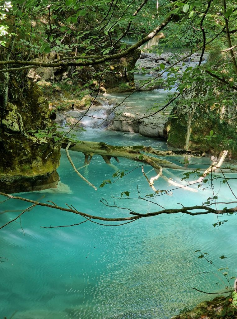 Denkend dat we het nu gezien hebben, vervolgen we onze route. De rivier blijft zo turkoois blauw, het lijkt bijna gefotoshopt. Dit is echt mijn favoriete kleur blauw. En zo helder dat je de stenen op de bodem kunt zien, en de vissen ziet zwemmen. Ongeveer 2,5 uur klimmen en klauteren we door dit ‘sprookjesbos’. We hebben er geen spijt van, zo waanzinnig mooi is het.