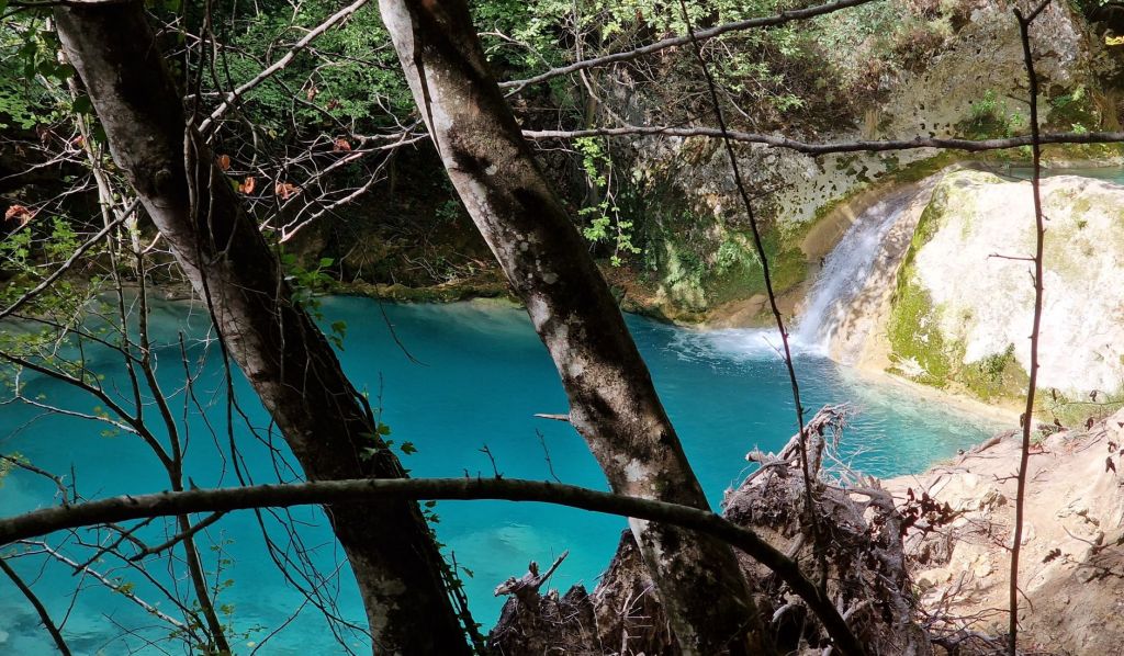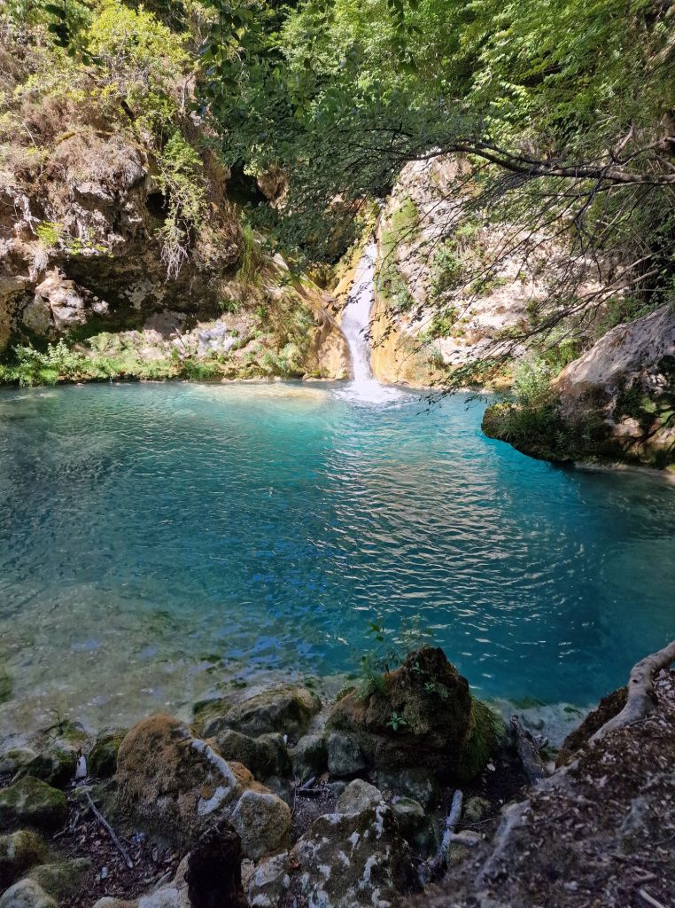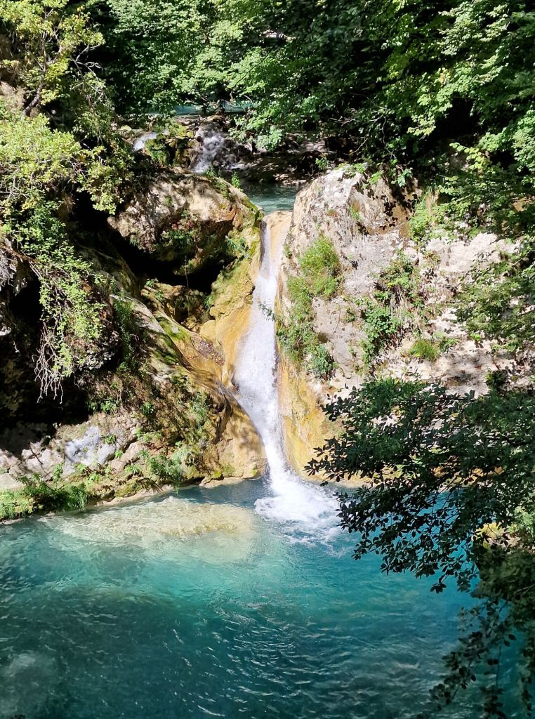 Voor we er erg in hebben zien we ineens een waterval, die neerkomt in een water zó blauw….. prachtig!