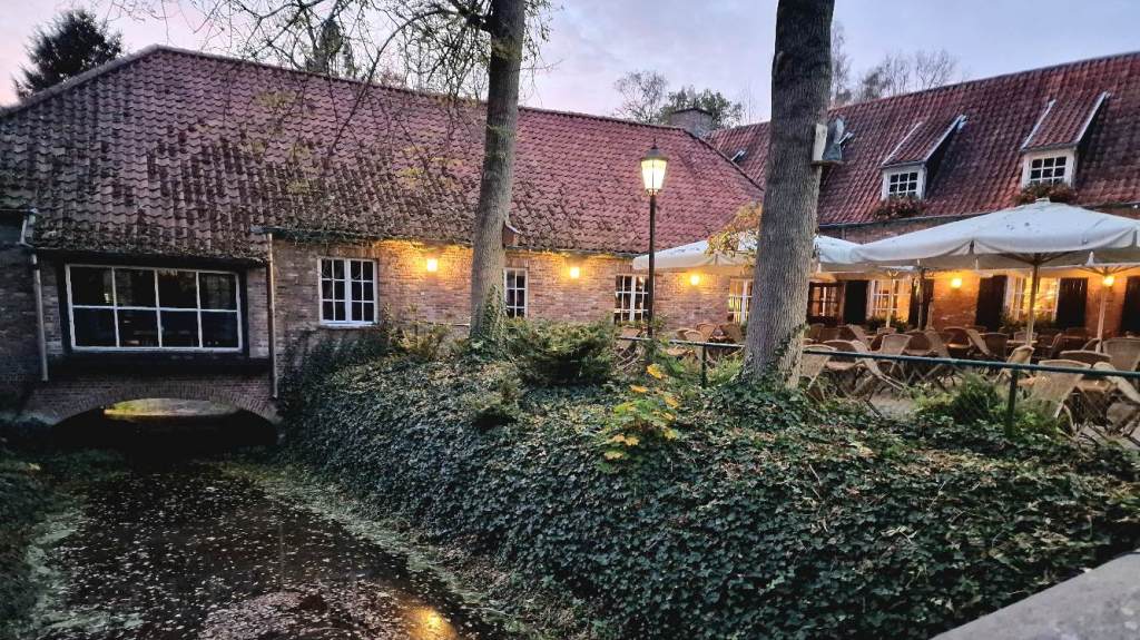 We hebben, behalve wat broodjes en kaas, geen ander eten ingeslaan dus we gaan iets eten in een taverne op een minuutje wandelen vanaf de parking. Het is maandagavond dus er zijn niet zoveel klanten in de zaak. Luc bestelt een stoofvlees met Postels bier, ik een broodje vegetarische hamburger. De zaak ruikt een beetje muffig, zoals een grootmoeders’ kast. Maar het ziet er gezellig uit en de bediening is vriendelijk.