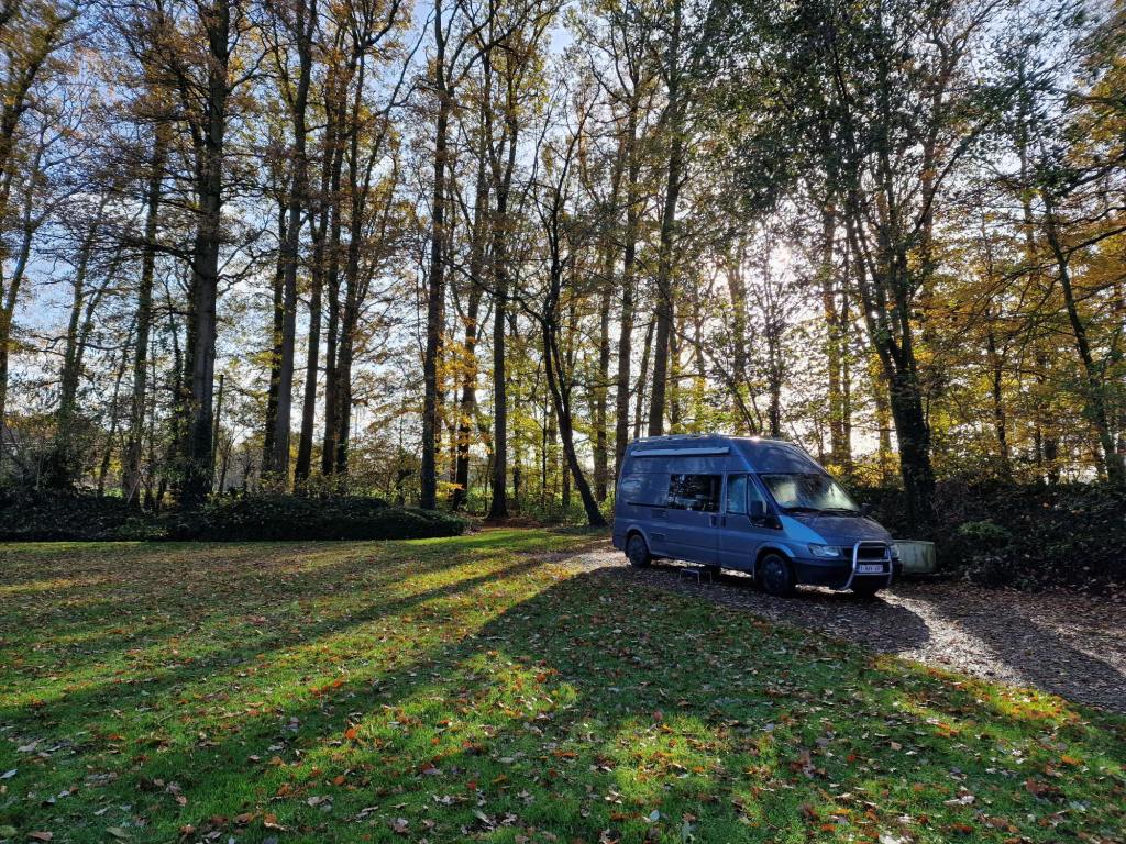 Het wordt al wat donker, dus het is even zoeken op die boerenbinnenweggetjes, maar rond 17 uur rijden we de lange modderige oprit op. Ondanks dat het eigenlijk niet zo ver van een weg ligt, lijkt het alsof je niet meer in de bewoonde wereld bent. Een megagrote voormalige boerderij, een binnenplaats met schuren, omgeven door deels weilanden en deels bos. Wat een prachtige plek om te wonen. Of om een nachtje met de bus te staan. De eigenaar heet ons welkom, en toont waar we ons het beste kunnen installeren. Naast een strook gras is een stukje verhard, wat vanwege de voorspelde regen nu interessanter is dan op een bospad. Hij toont ons ook nog een ruimte waar een toilet is, een wasplaats, en een koelkast met drankjes. Een bakje ernaast waar je dan het geld in kunt doen. Mooi dat dat hier nog zomaar kan.
