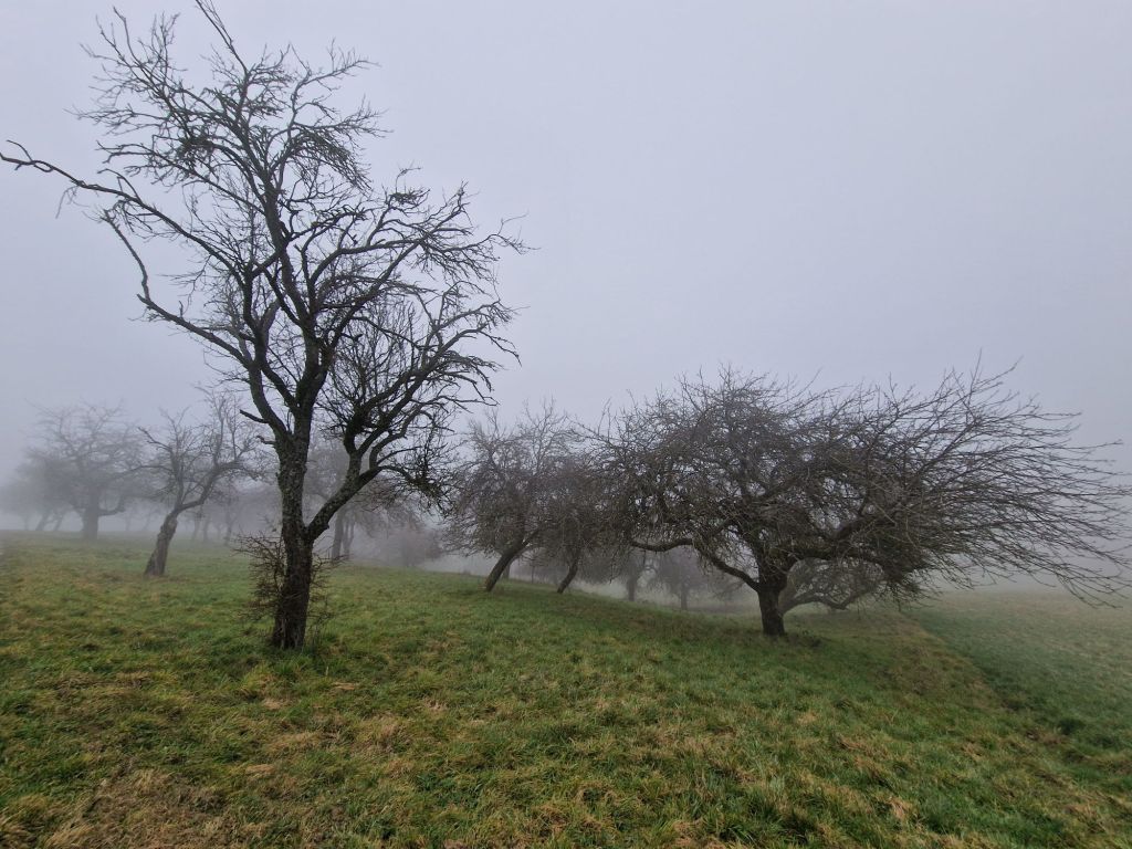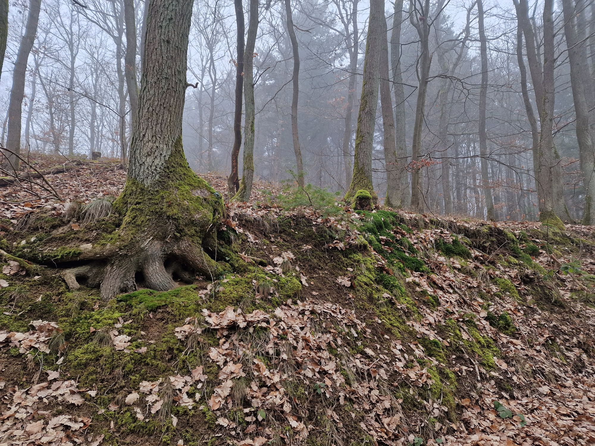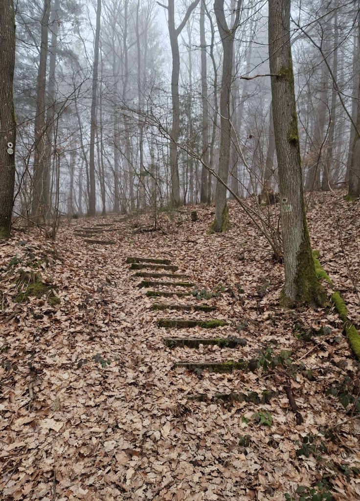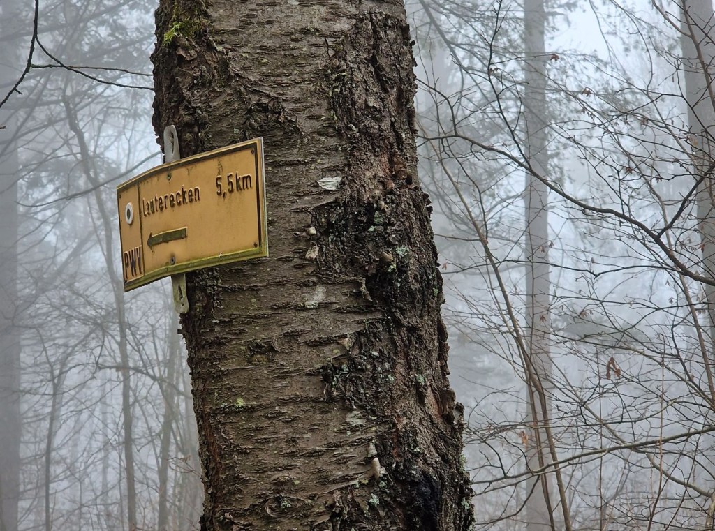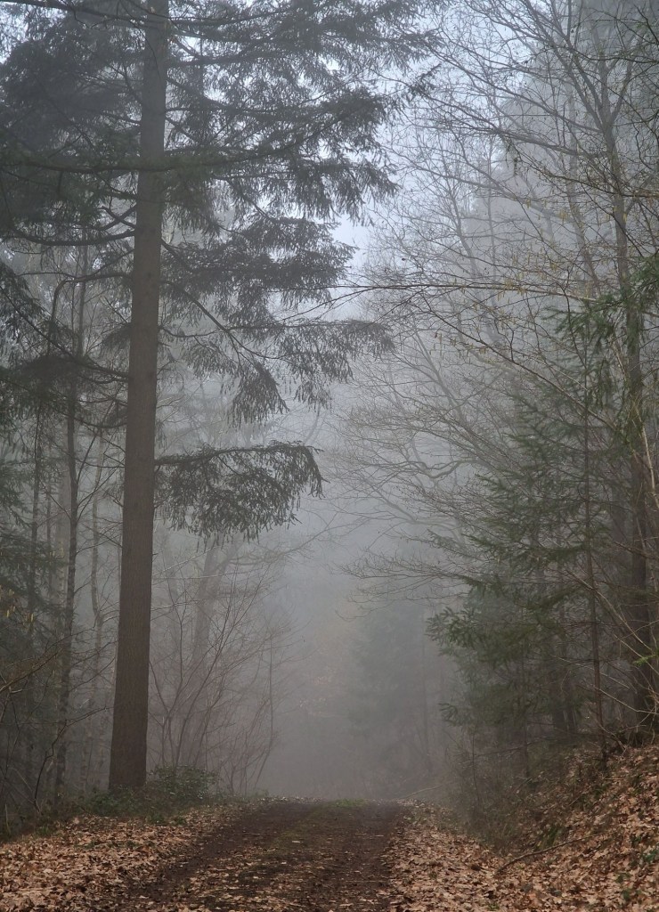 We gaan bij een of andere grot uitkomen, begrepen we. Maar we verdwalen. Zolang we geen borden zien met zijn pijlen is het gewoon rechtdoor. Achteraf blijkt dat er ergens een cruciale pijl op de grond lag. De ‘cave’ vinden we niet. Via Google maps proberen we de terugweg weer te vinden. Intussen wordt de mist hier steeds dichter i.p.v. de beloofde zon. En koud. Het is ijzig koud. Zonder de cave gezien te hebben beginnen we aan de terugweg.