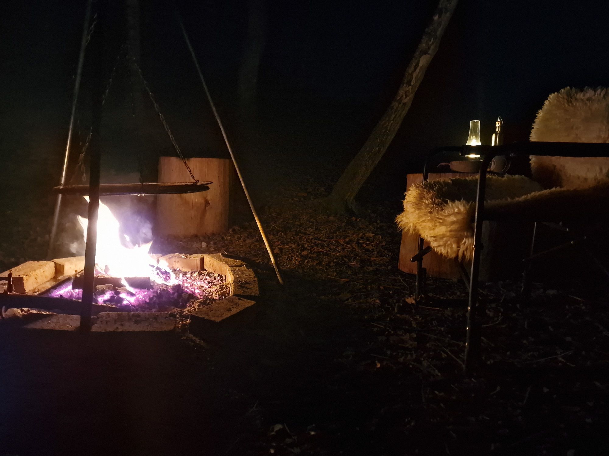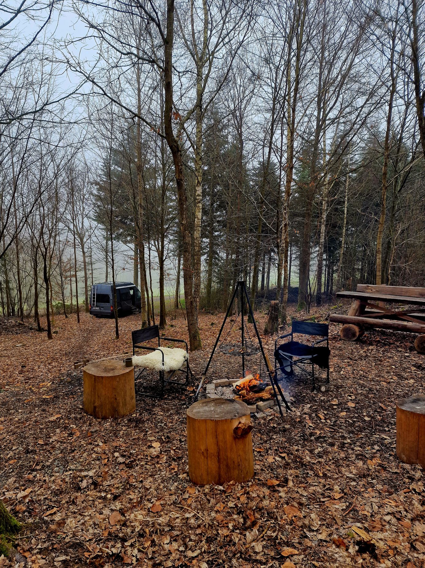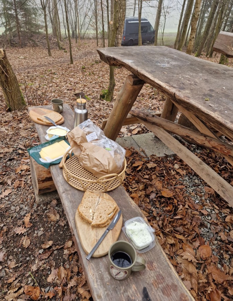 Op dinsdagochtend worden we pas redelijk laat wakker. Het is al bijna 10 uur. Wauw, dat sliep goed hier. Ik schuif het gordijn opzij en verwacht een beginnend stralend zonnetje te zien, maar zie enkel een dichte grijze mist. Luc zet even de gaskachel aan, en ik zet een kan koffie. We halen het sd-kaartje uit de wildcam en bekijken de beelden, maar helaas…..no wildlife. Daarna verhuizen we naar de stookplek. Ontbijten bij het vuur, wat een mooi begin van de dag.
