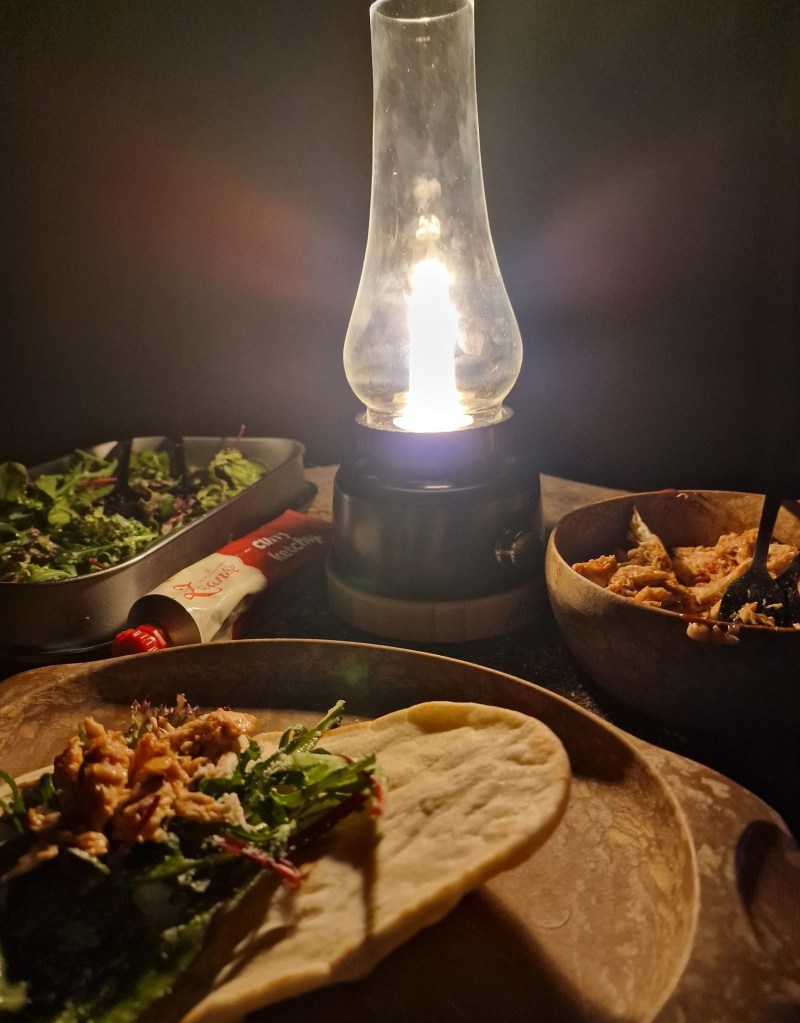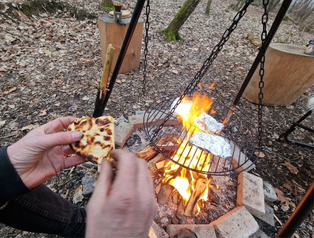 Aan de camperplaats steken we opnieuw het vuur aan. Een probeersel van een overblijfsel flatbread belegd met wat kaas, blijkt verfrommeld in alu-folie nog een megalekkere cowboycroque te zijn. (Eigen verzinsel. Leuk idee voor een volgende keer, dan met mozzarella, tomaat en een pestosaus ofzo.