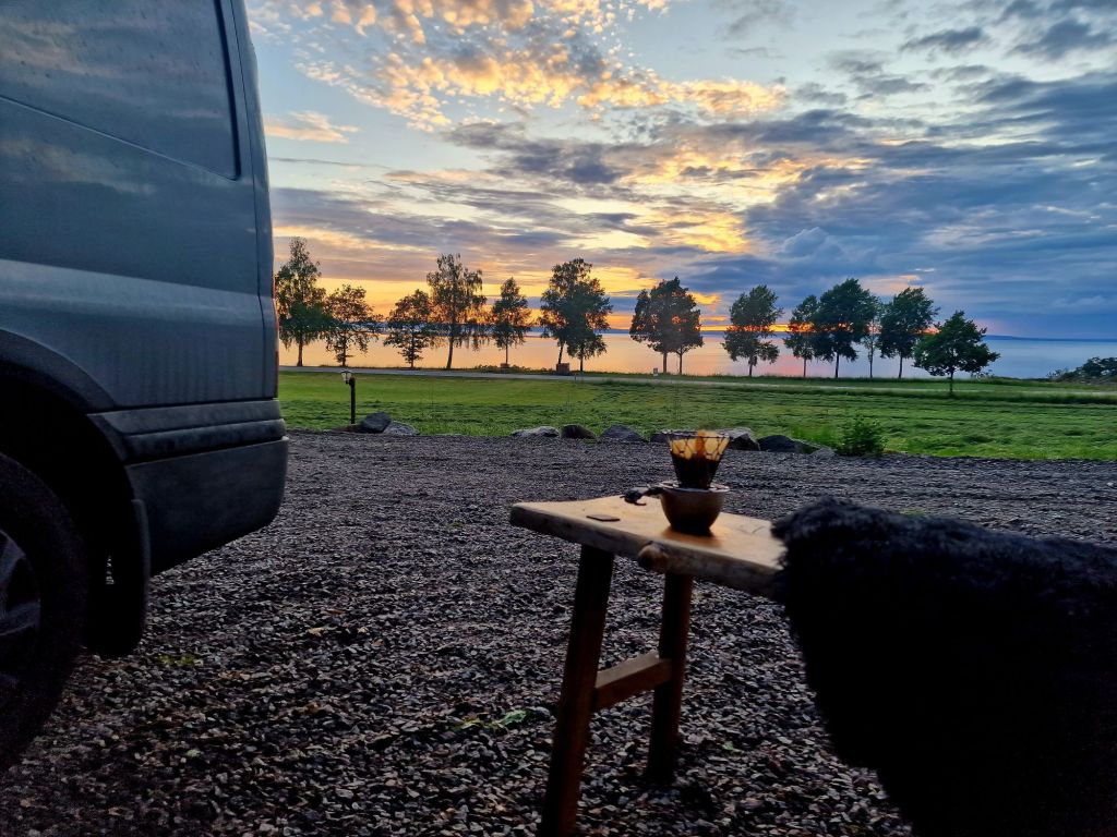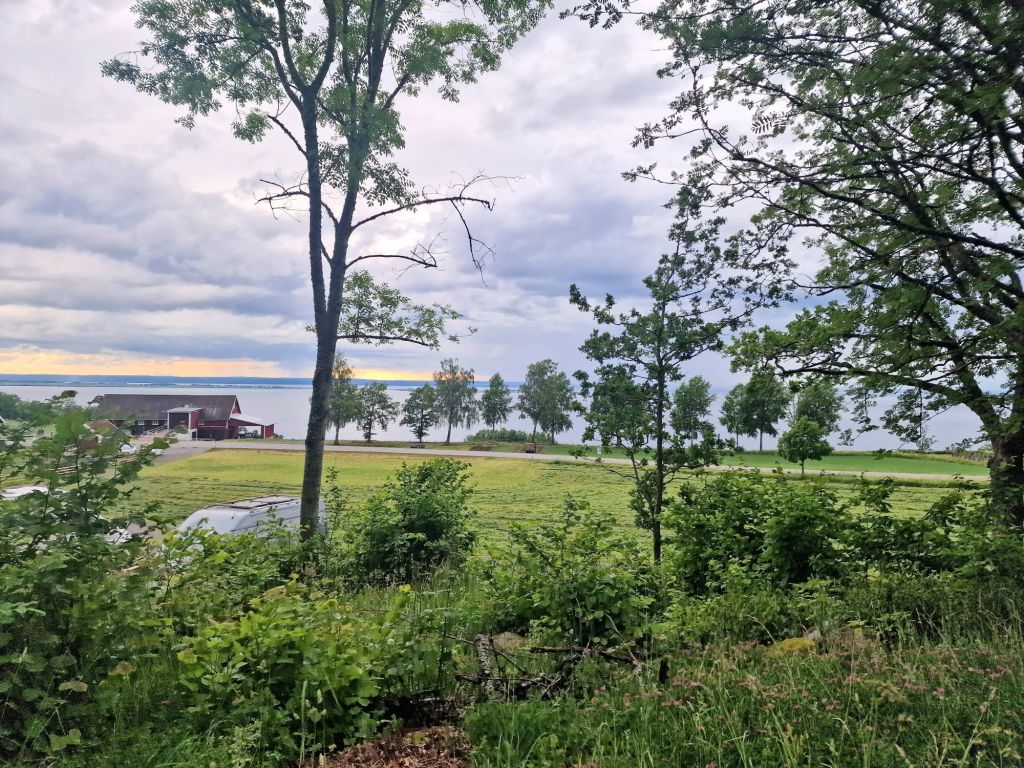 Alweer kunnen we wat kilometers maken. We nemen ergens een afslag om een paar boodschappen te doen voor het eten, en dan weer door. Een stukje voorbij Jönköping gaan we op zoek naar een slaapplek. De eerste die we vinden zou een mooie camping zijn met zicht op het meer. Redelijk duur, maar soit, als het dan echt zo’n mooie plek is kan dat. Er zijn genoeg vrije plaatsen. Sterker nog, alle plekken zijn nog leeg. Ik snap waarom. Oké, er is 1 plek bij van waaruit je zicht hebt op het meer, maar dan moet je wel flink op je tenen gaan staan. En de garages en bouwwerf negeren die tussen de plek en het meer liggen. Hier hebben we geen zin in. De volgende is enkele kilometers rijden via kronkelige smalle wegen. Een mooie route. Helaas vindt Luc de plek helemaal niks. Ik wel, maar we zijn met 2, dus liefst dat we het allebei tof vinden. We passeren er nog ene per toeval, maar dat is echt een parking. We hebben nog even tijd en proberen een camperplek bij een particulier. Wel 15 euro, zonder voorzieningen behalve water, maar ook uitzicht op het meer.